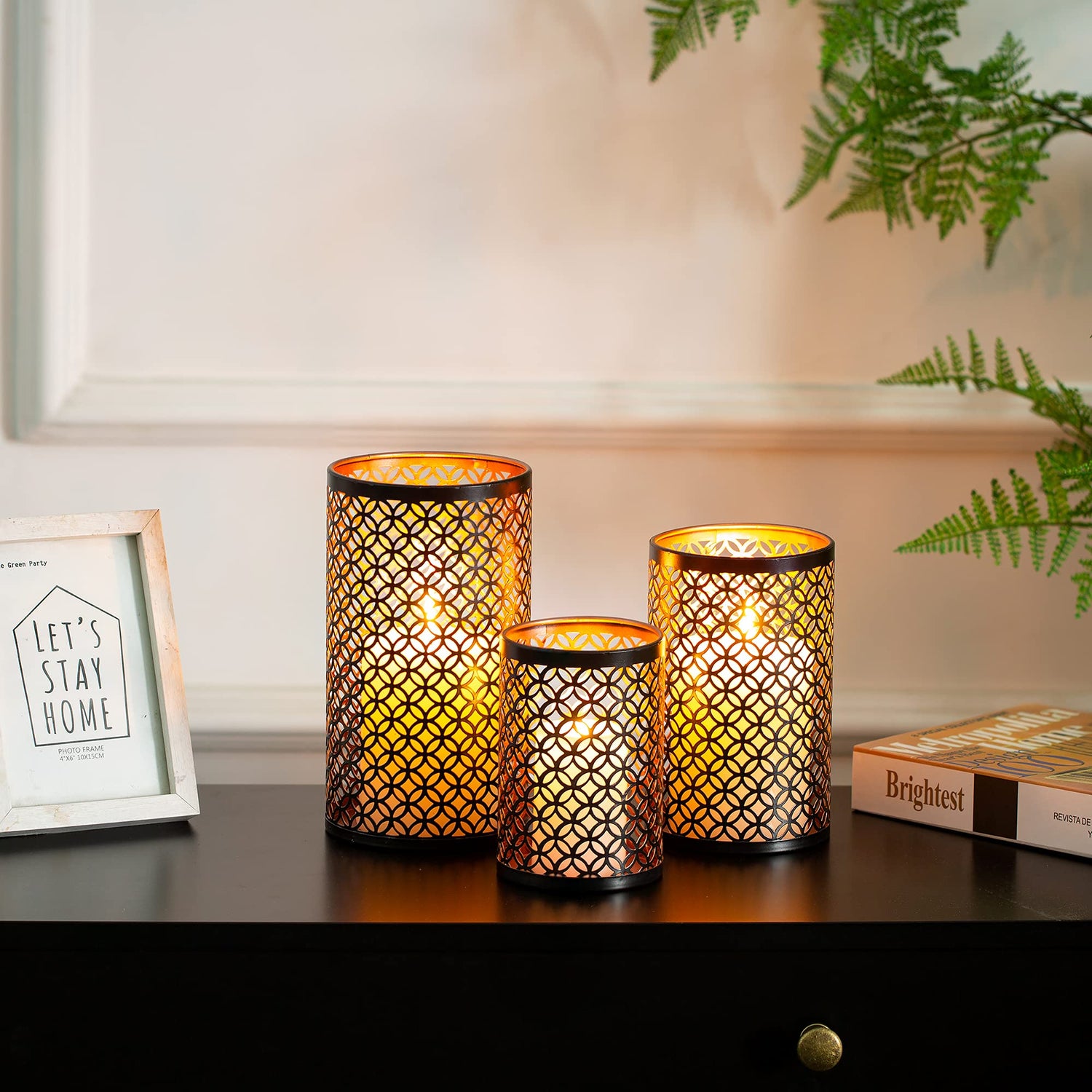 Romadedi Kerzenhalter Metall Teelichthalter Schwarz & Gold - 3er Set Kerzenständer für Teelichter Kerzen Orientalisches Aushöhlen Windlicht Vintage Wohnzimmer Tischdeko Innen Außen Deko 20/16/13cm