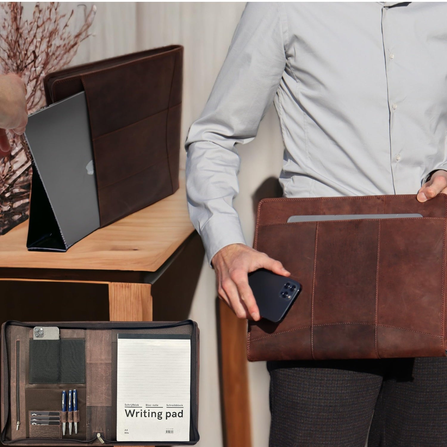 • Die Schreibmappe auf Ihrem Tablet, Laptop und A4-Schreibblock organisiert mitnehmen. Stilvolle Safekeepers Ledermappe A4 Modell von Safekeepers. So nehmen Sie das Tablet ganz einfach im Außenfach und Innenfach mit. Das Außenfach ist geeignet für 14-Zoll-Tablet Pro Tablet und Laptops.