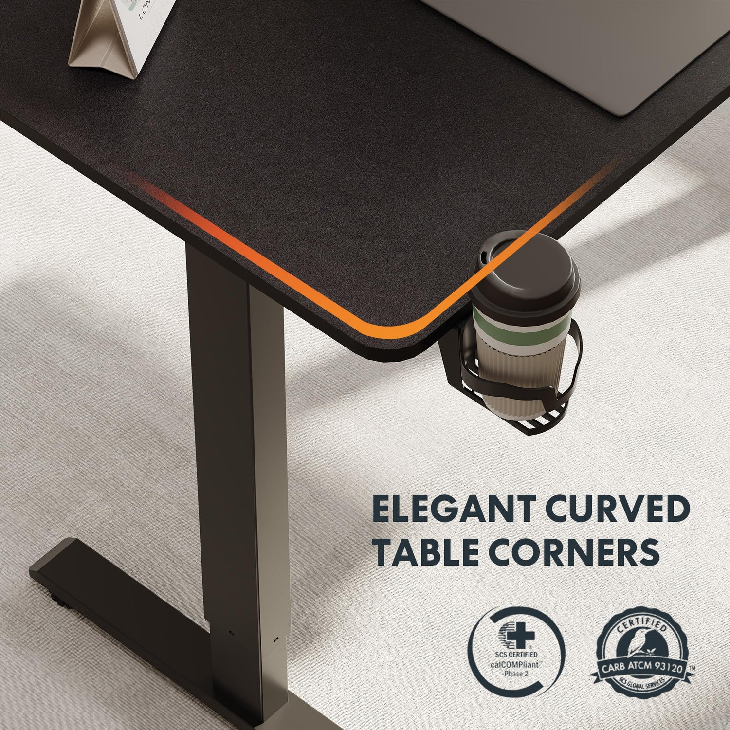 • SANODESK schwarzer L-förmiger höhenverstellbarer Schreibtisch 160 x 75 cm mit Speicherfunktion und Haken, im Homeoffice.