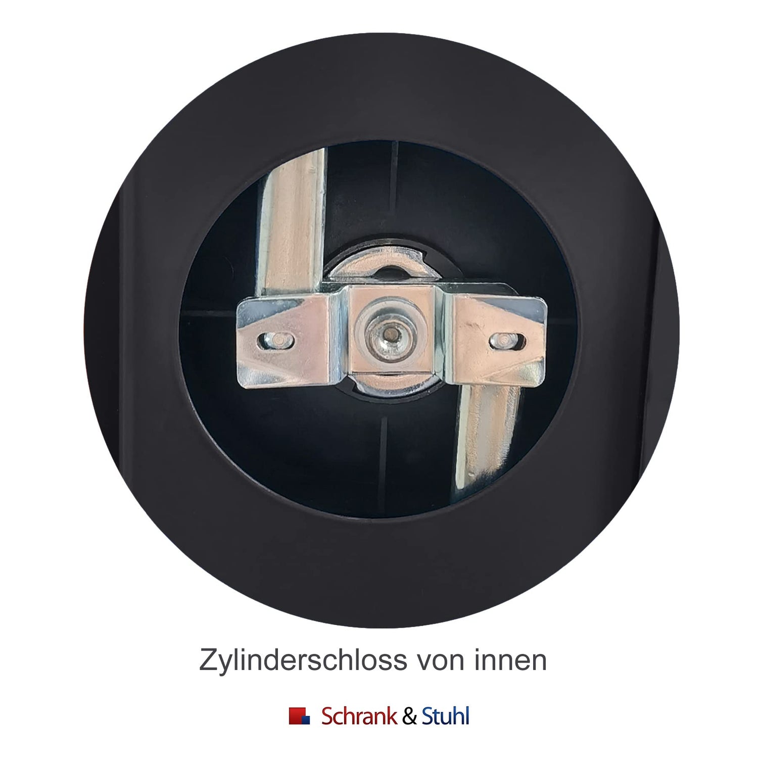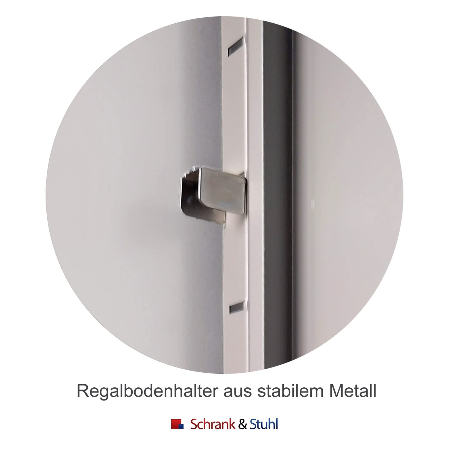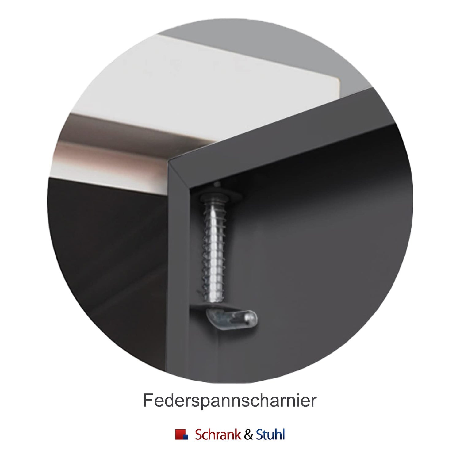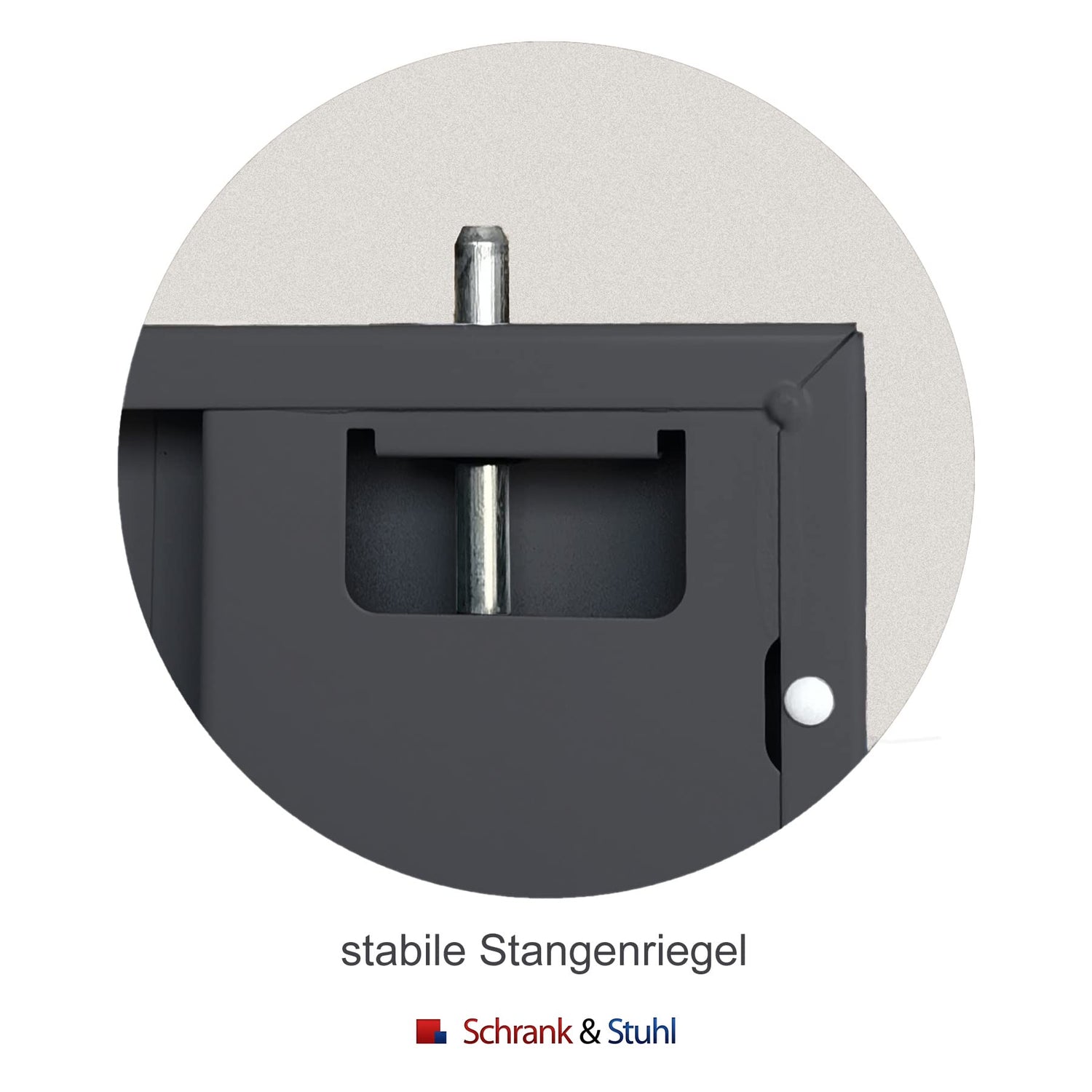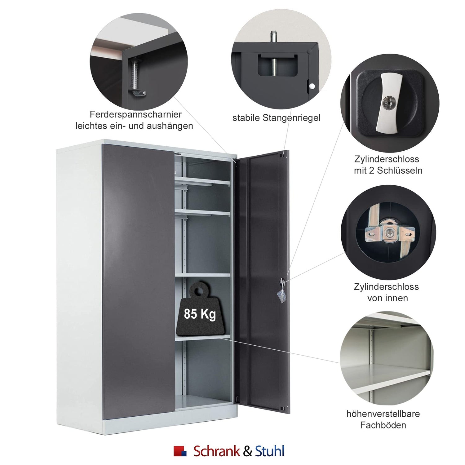 • Lieferung – Metallschrank in Grau RAL 7035 (Korpus) / Anthrazit RAL 7016 (Türen), mit Zylinderschloss und 2 Schlüsseln, 78,5 kg. Der Materialschrank wird im montierten Zustand geliefert.