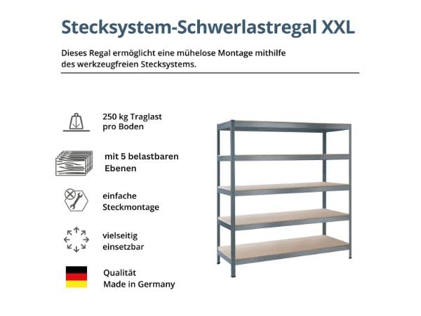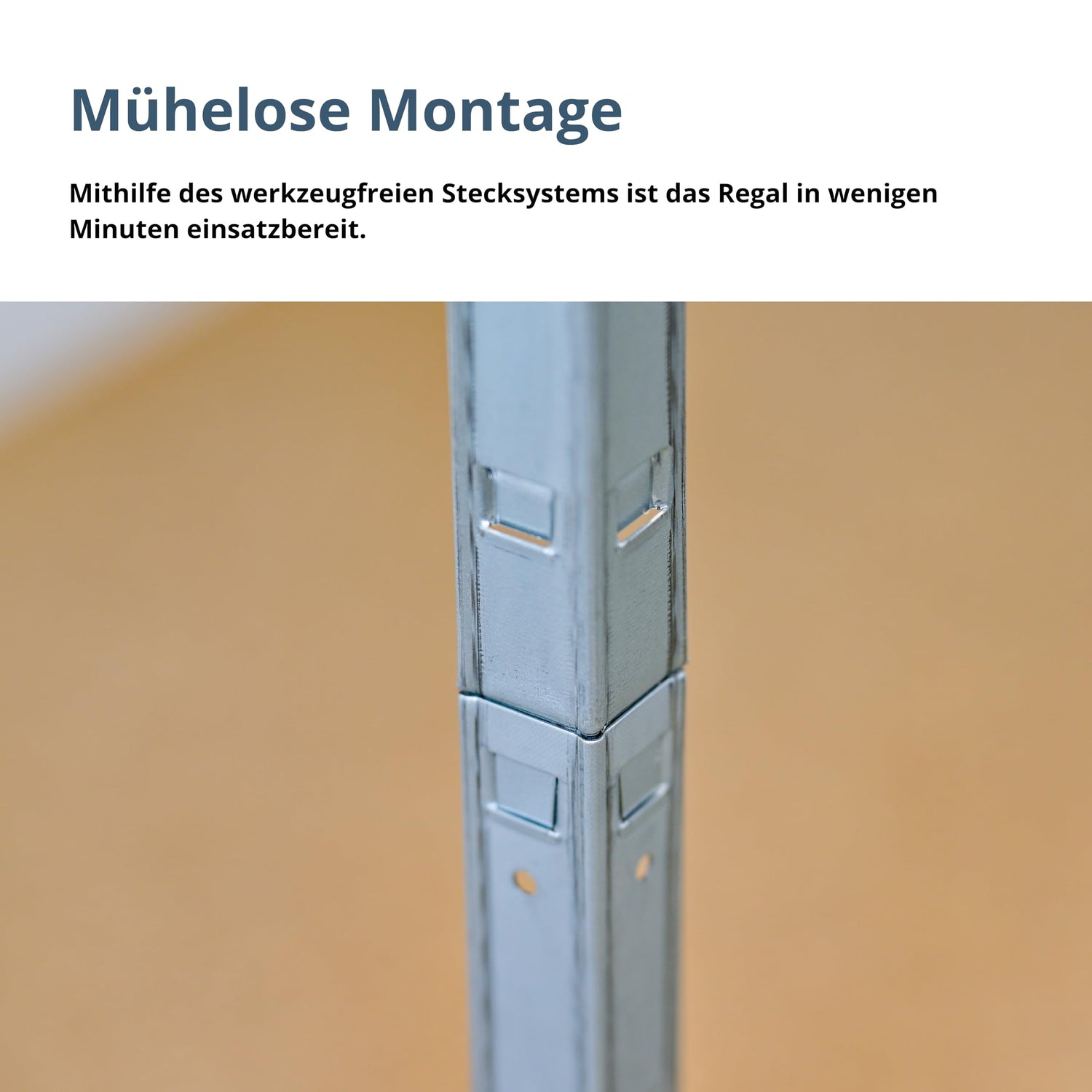 • Schneller Aufbau: Das Schwerlastregal überzeugt durch eine einfache Montage. Das Stecksystem ermöglicht einen schnellen und werkzeuglosen Aufbau, ohne aufwendiges Schrauben