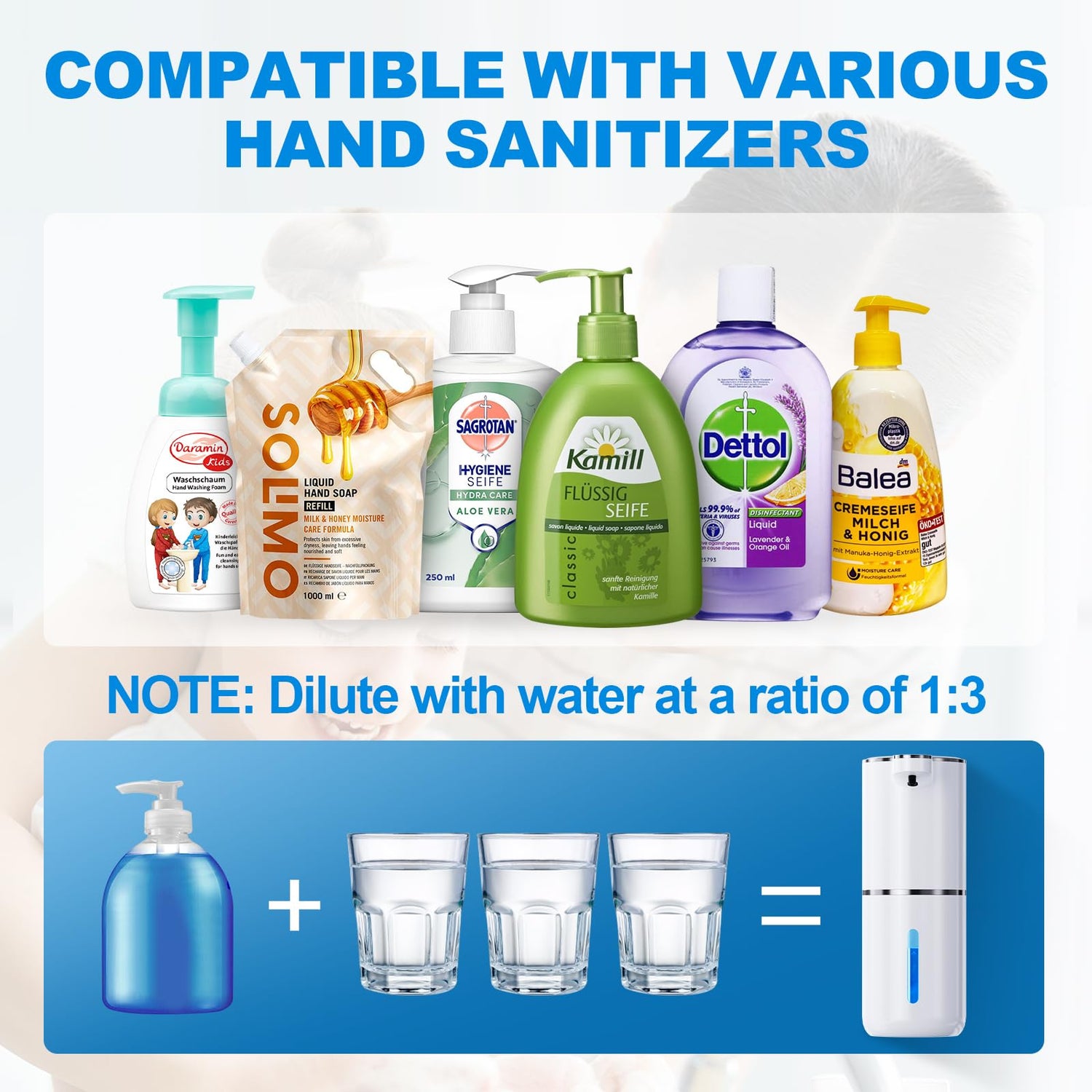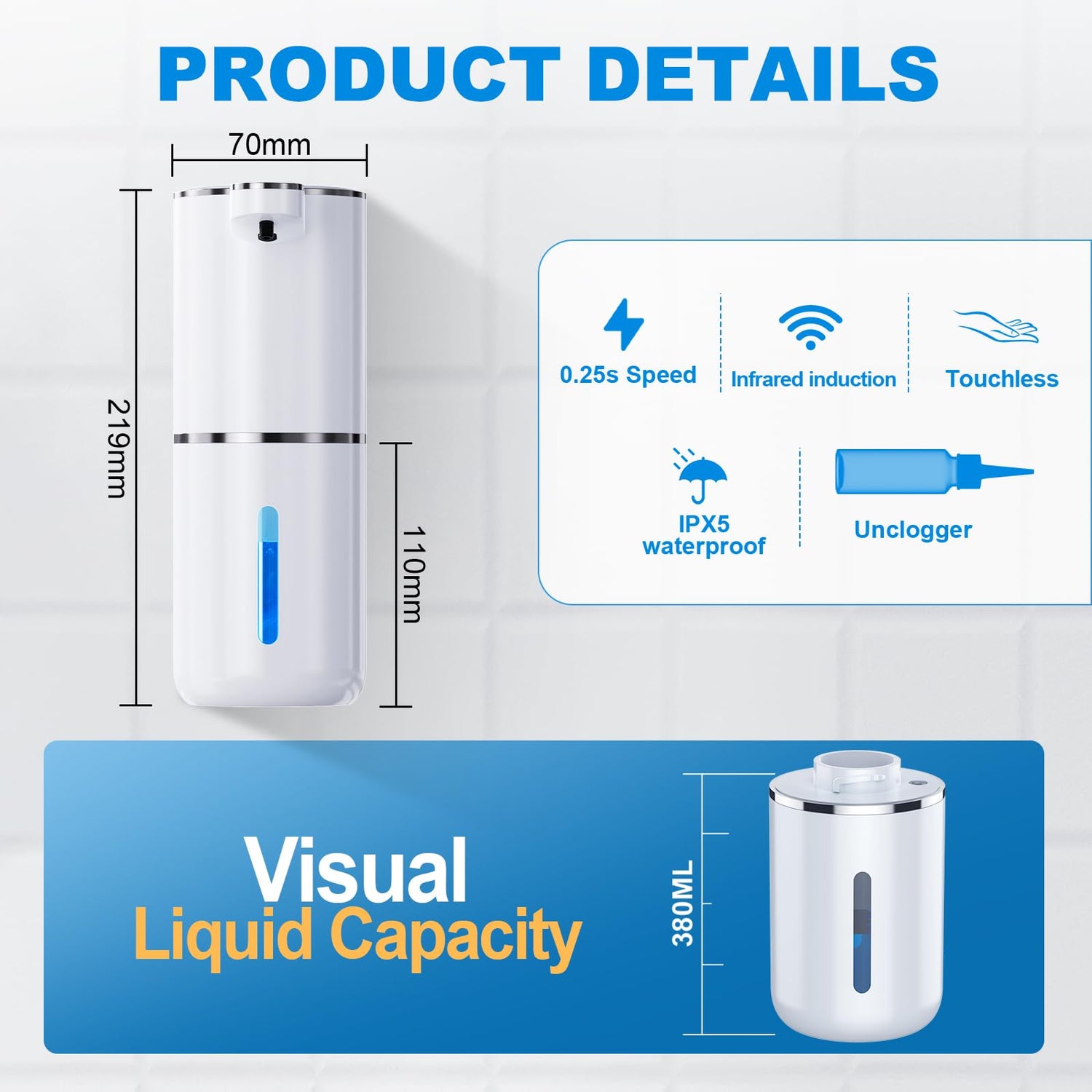 • Elektrischer Seifenspender: Dieser automatische Schaumseifenspender verwendet eine fortschrittliche intelligente Infrarot-Sensortechnologie, die das Berühren des Seifenspenders überflüssig macht. Er spendet den Seifenschaum schnell in 0,25 s. So wird das Händewaschen bequemer und hygienischer, und der berührungslose Seifenspender verhindert, dass Flecken auf dem Gerät zurückbleiben, so dass Sie vor Keimen geschützt sind!