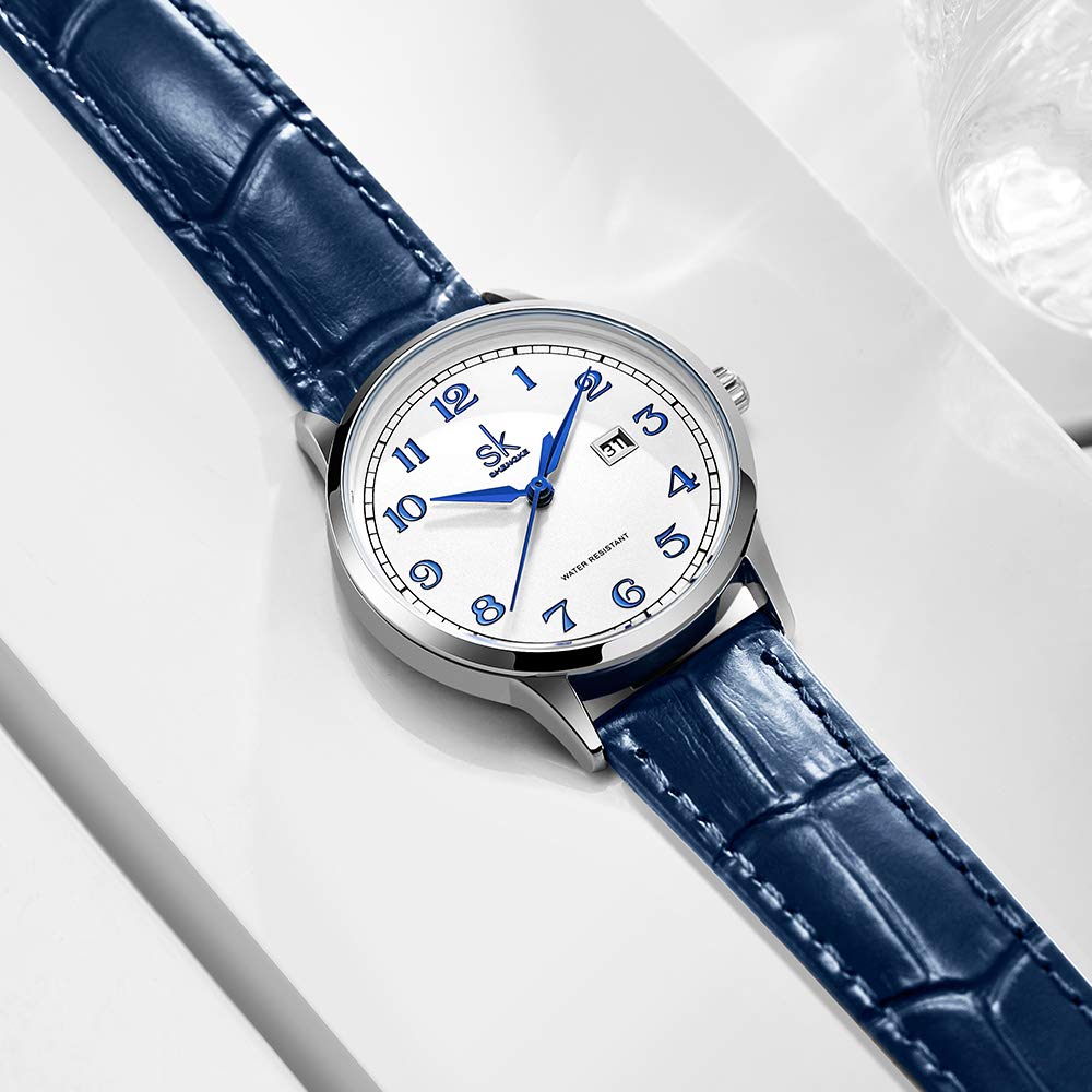 SHENGKE SK Classic Business Women Watches with Stainless Steel Band and Genuine Leather Elegant Ladies Calendar Watch(Arabic Number-Blue Leather)