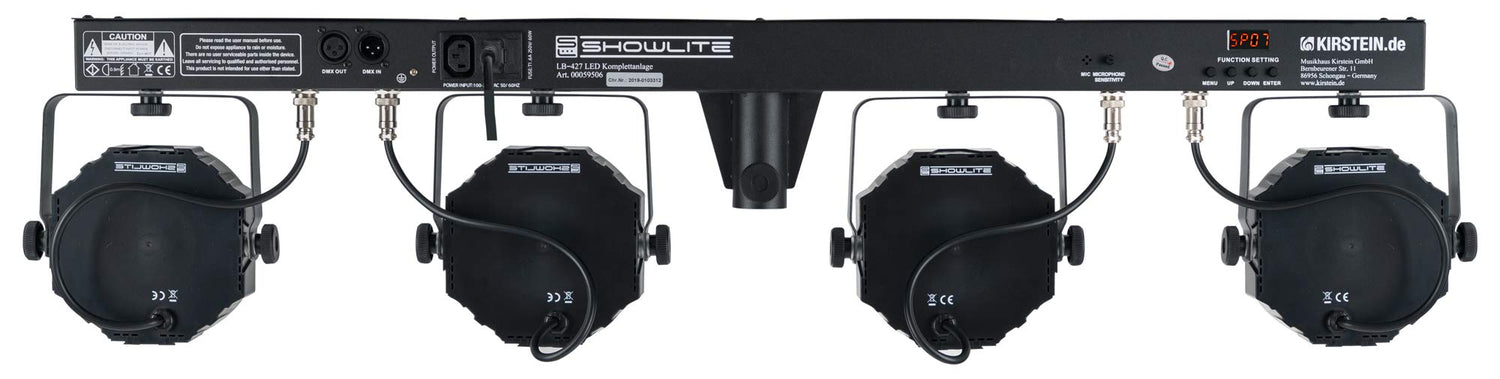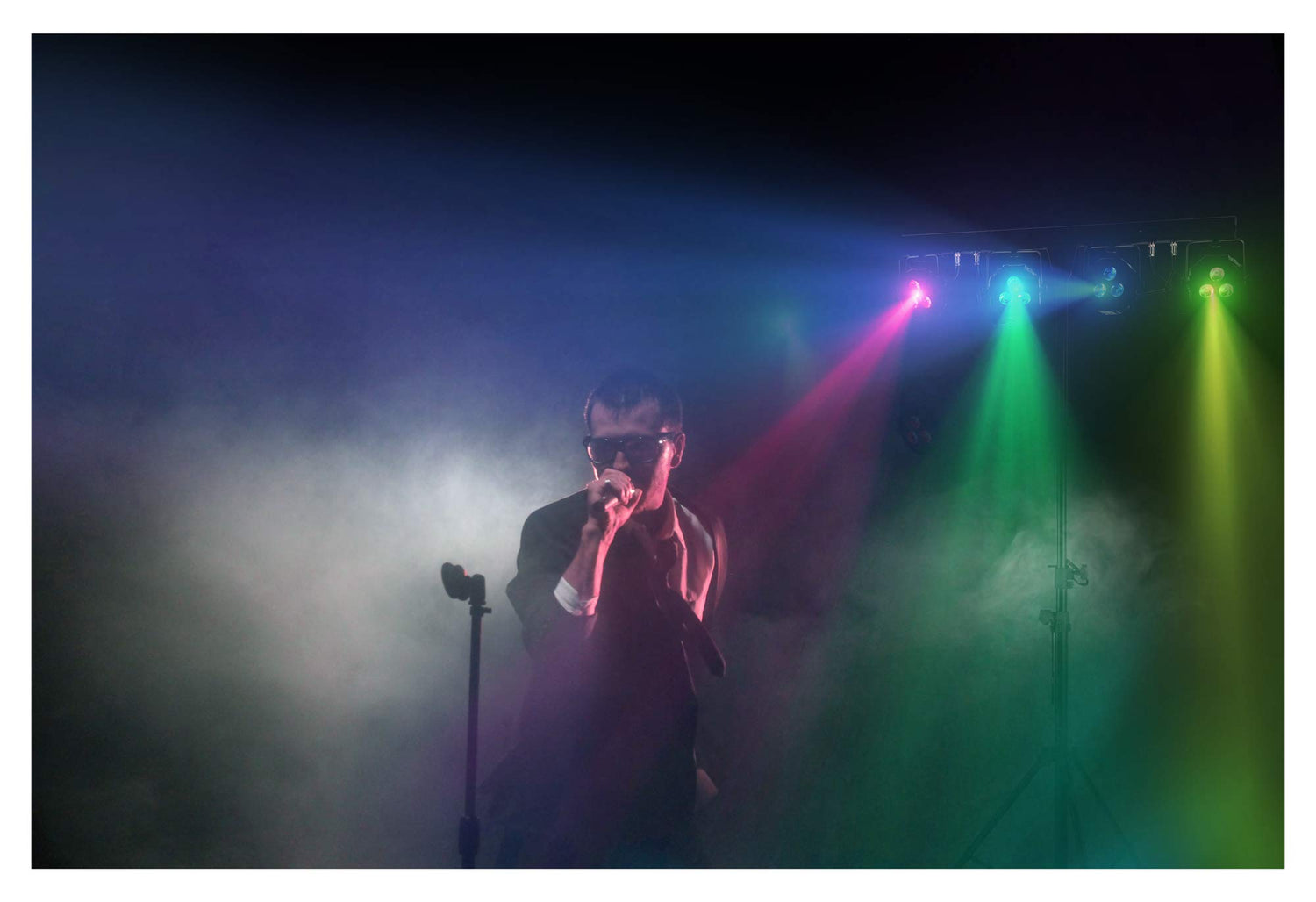 • Jede der 4 Lichteinheiten separat dreh- und neigbar, eingebautes Mikrofon mit Empfindlichkeitsregler, Leistung: 108 Watt