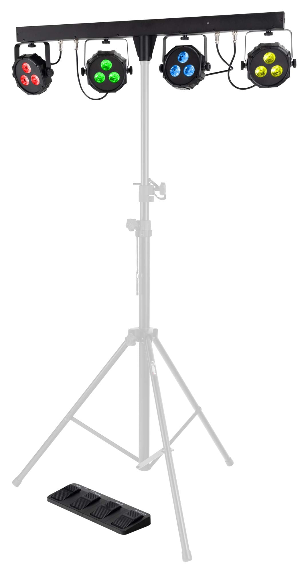 Showlite LB-427 LED RGB Lichtanlage - vier PAR-Spots mit je 3 St. 9W LEDs - steuerbar via DMX 512, Wireless-Fußpedal oder manuell, inkl. Transporttasche und Fußfernsteuerung