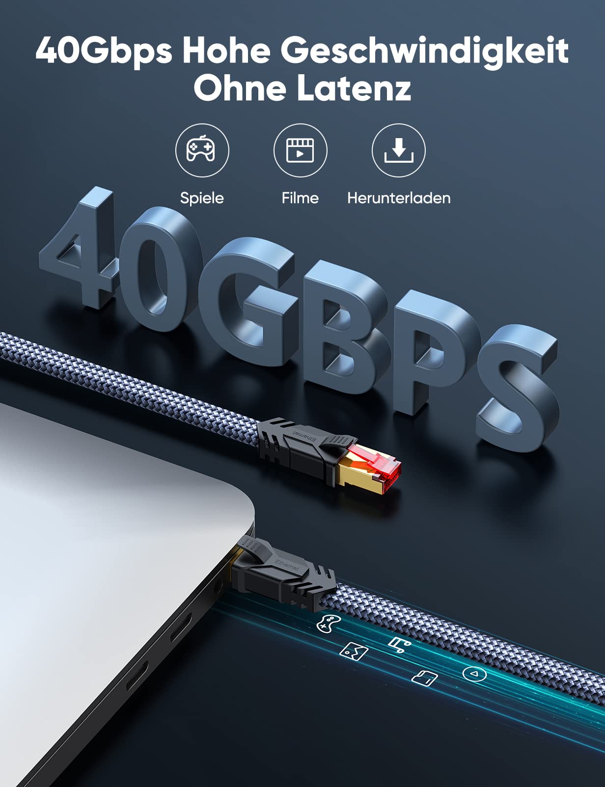 • 💻【40Gbps 2000MHz LAN Kabel】Cat 8 Netzwerkkabel unterstützt bis zu 40Gbps Datenübertragung (4x V.S Cat 7 mit 10Gbps) und 2000MHz Bandbreite (3x V.S Cat 7 mit 600MHz) für stabile Internetverbindungen. Sie können eine Verbindung zu Ihrem LAN/WAN-Segment und Ihren Netzwerkgeräten herstellen, um einen Hochgeschwindigkeits-Internetzugang zu erhalten und Videos, Musik und andere Daten zu streamen, ohne sich mit langsamen Internetgeschwindigkeiten herumschlagen zu müssen.
