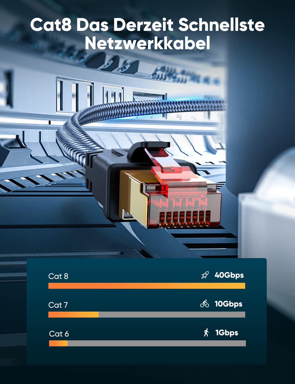• 💻【Ethernet Kabel Weitgehend Kompatibel】Dieses Hochgeschwindigkeits Cat 8 netzwerkkabel ist kompatibel mit Cat 7, Cat 6a, Cat 6, Cat 5, Cat 5e Geräten. Er funktioniert mit allen Geräten mit RJ45-Anschluss, wie z. PS5, PS4, PS3, Raspberry Pi 4, TP-Link Powerline-Adapter, WiFi-Extender/Booster, Switches, Smart-TVs, Sky Q-Boxen, TV-Decoder, BT Smart Hubs, Virgin-Modems, Patchbays WiFi-Router, PCs, Netzwerkdrucker, Media-Player, TV-Boxen, Internet-Telefone, Freebox, Livebox, Bluray Player usw.