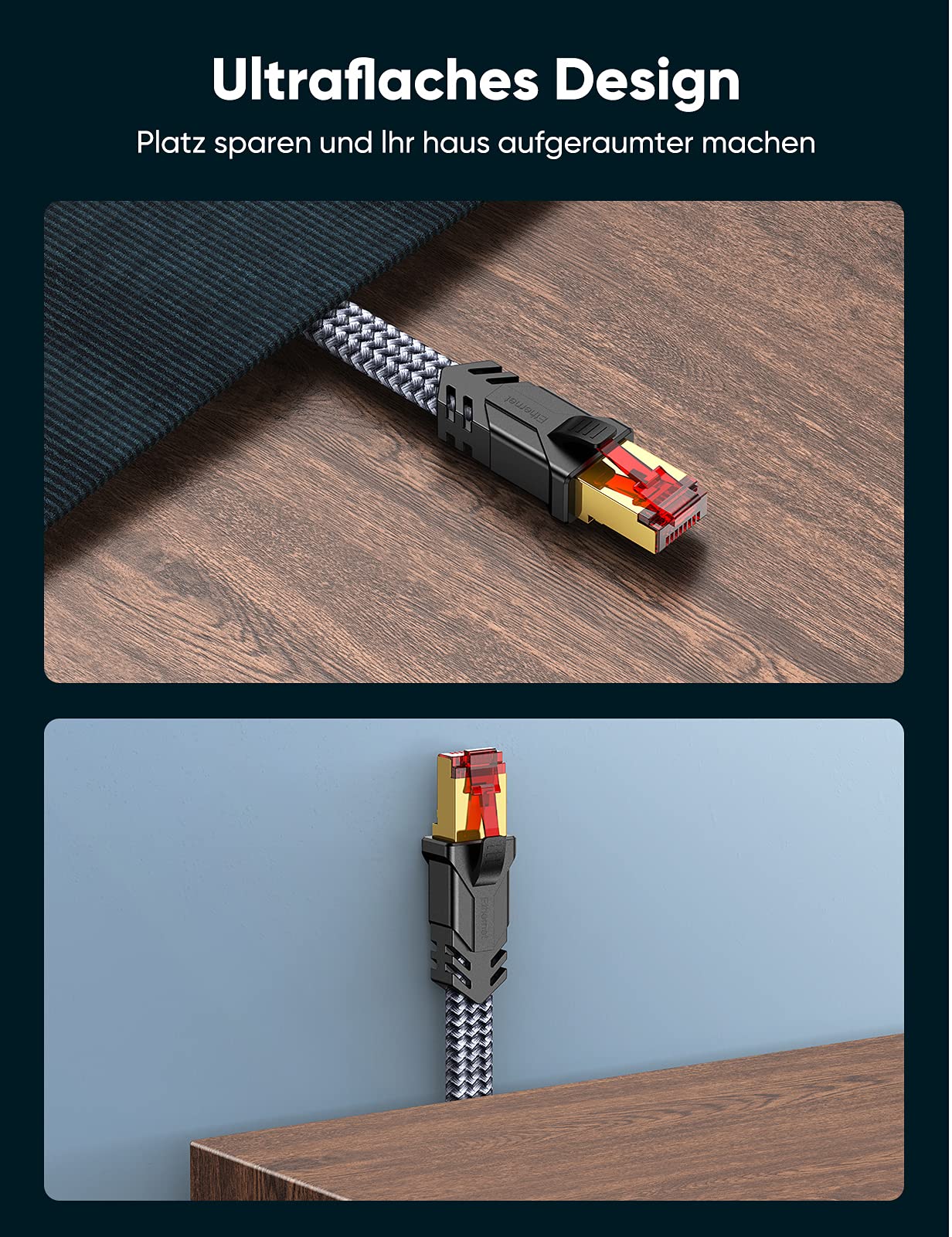 • 💻【CAT 8 Flaches Netzwerkkabel】 Idealer Partner für Zuhause und Büro. Dieses flache ethernet kabel kann aufgrund des überlegenen flachen Designs größeren Biegeradien standhalten. Es kann leicht sein, sich mit flachen Seiten um Ecken zu biegen, die beste Wahl für Ihre Netzwerkeinstellungen zu Hause und im Büro. Das LAN Kabel benötigt beim Verlegen weniger Platz, ideal zum Verlegen unter Türrahmen, Teppichen, Laminat oder Unterputz. Flaches LAN kabel was besser ist als herkömmliche runde kabel.