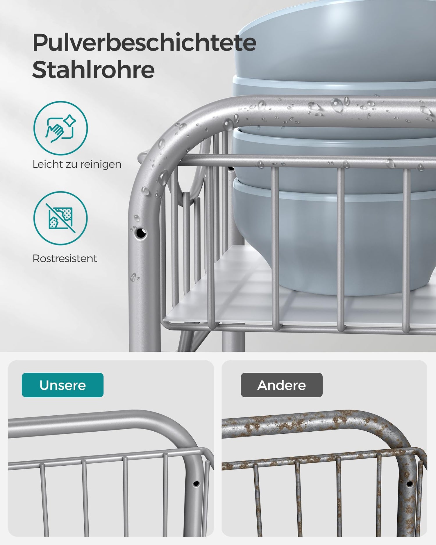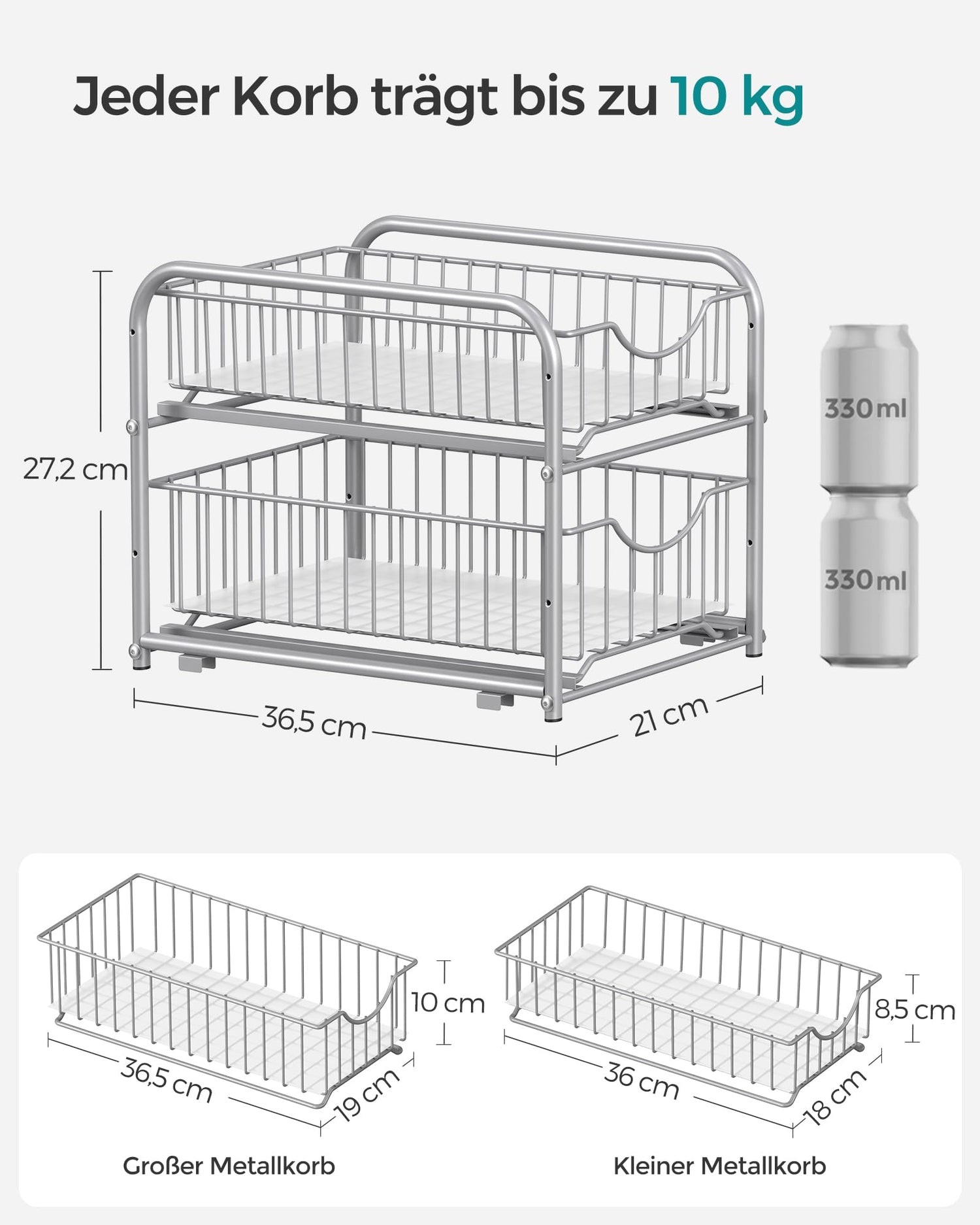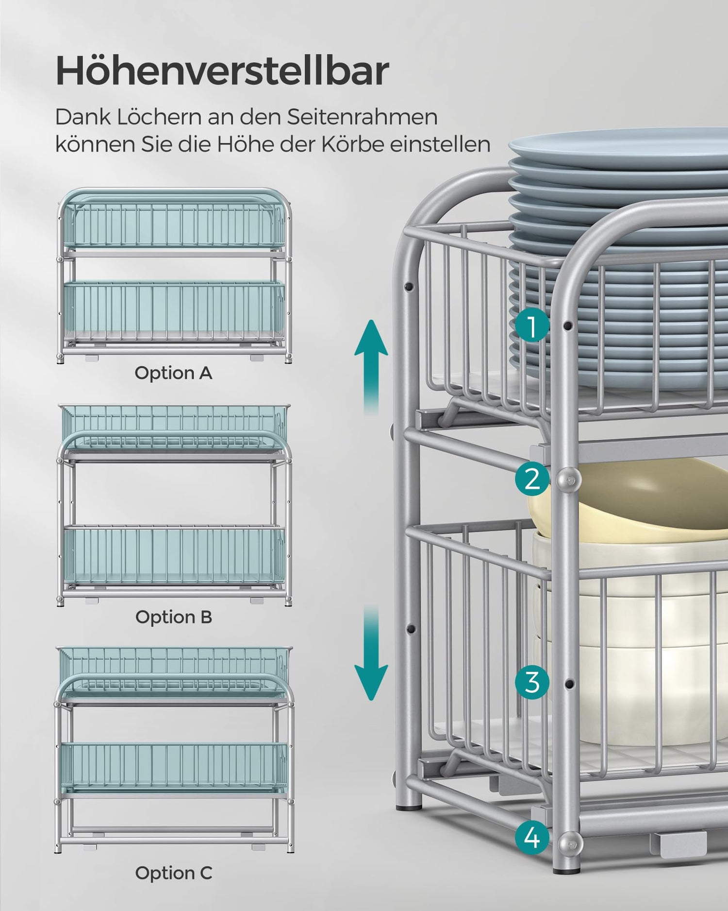 SONGMICS Küchenschrank Organizer, Küchenregal, Ordnungssystem, 2 Ebenen, stapelbar, erweiterbar, mit Metallkörben, für Küche, metallisches Silber KCS017E01