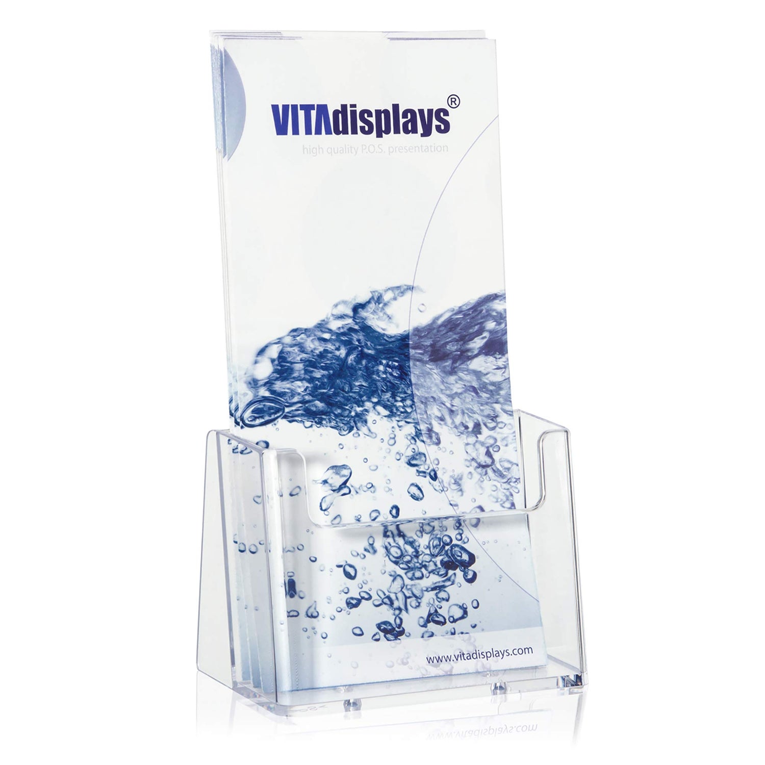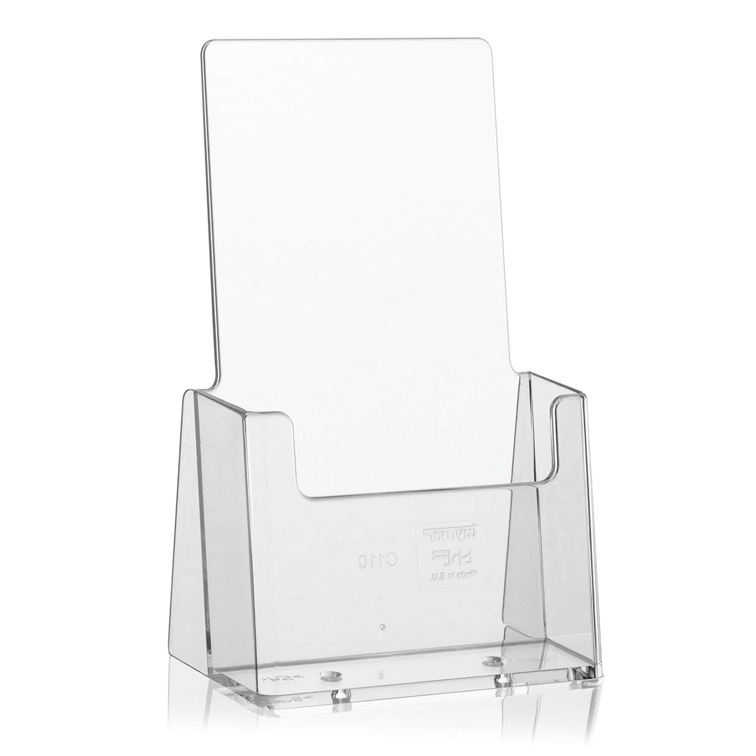 Standfester DIN Lang Flyerständer der Marke taymar als transparenter „trifold“ Flyerhalter, Tisch-Prospekthalter, Prospektständer, glasklarer Tischprospektständer für DL Flyer und DIN A6 Postkarten