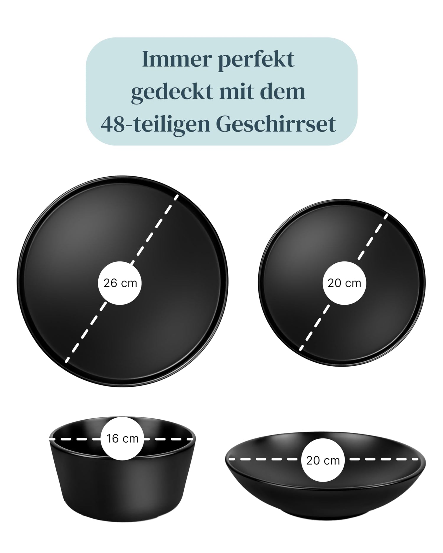 Steingut Geschirrset 12 Pers. 48-tlg Hochwertiges Steingut Geschirr Set- Schüssel- und Teller Set- Tafelservice 12 Personen Geschirrsets in matt schwarz