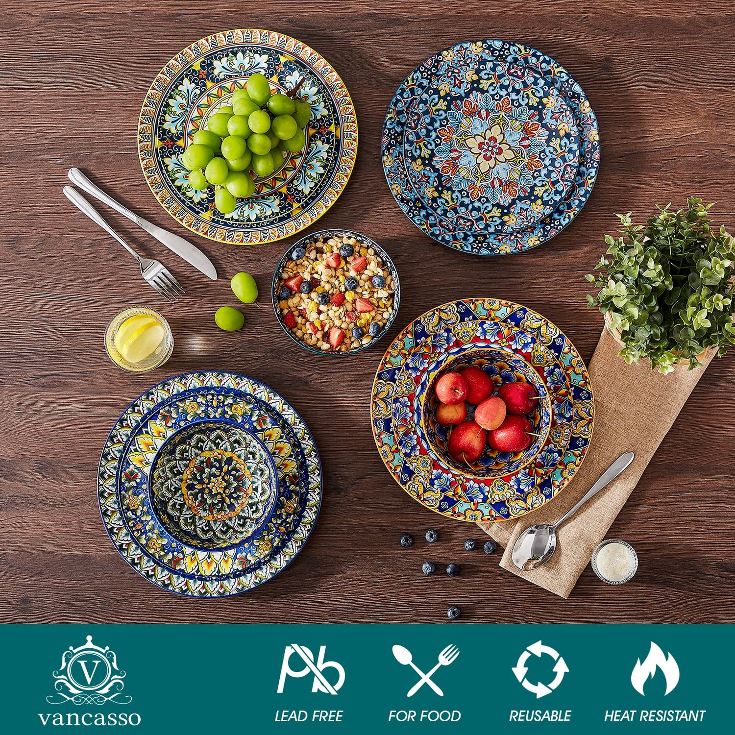• 【Lebendiges und Farbenfrohes Design】Das 18-teilige Geschirr Vancasso Bohemian zeichnet sich durch ein charmantes und kompliziertes Design aus, das die freigeistige Essenz der böhmischen Kultur widerspiegelt. Die lebendigen Farben und künstlerischen Muster rufen ein Gefühl der Freude und Positivität hervor und machen Ihr Esserlebnis lebendig und glücklich.