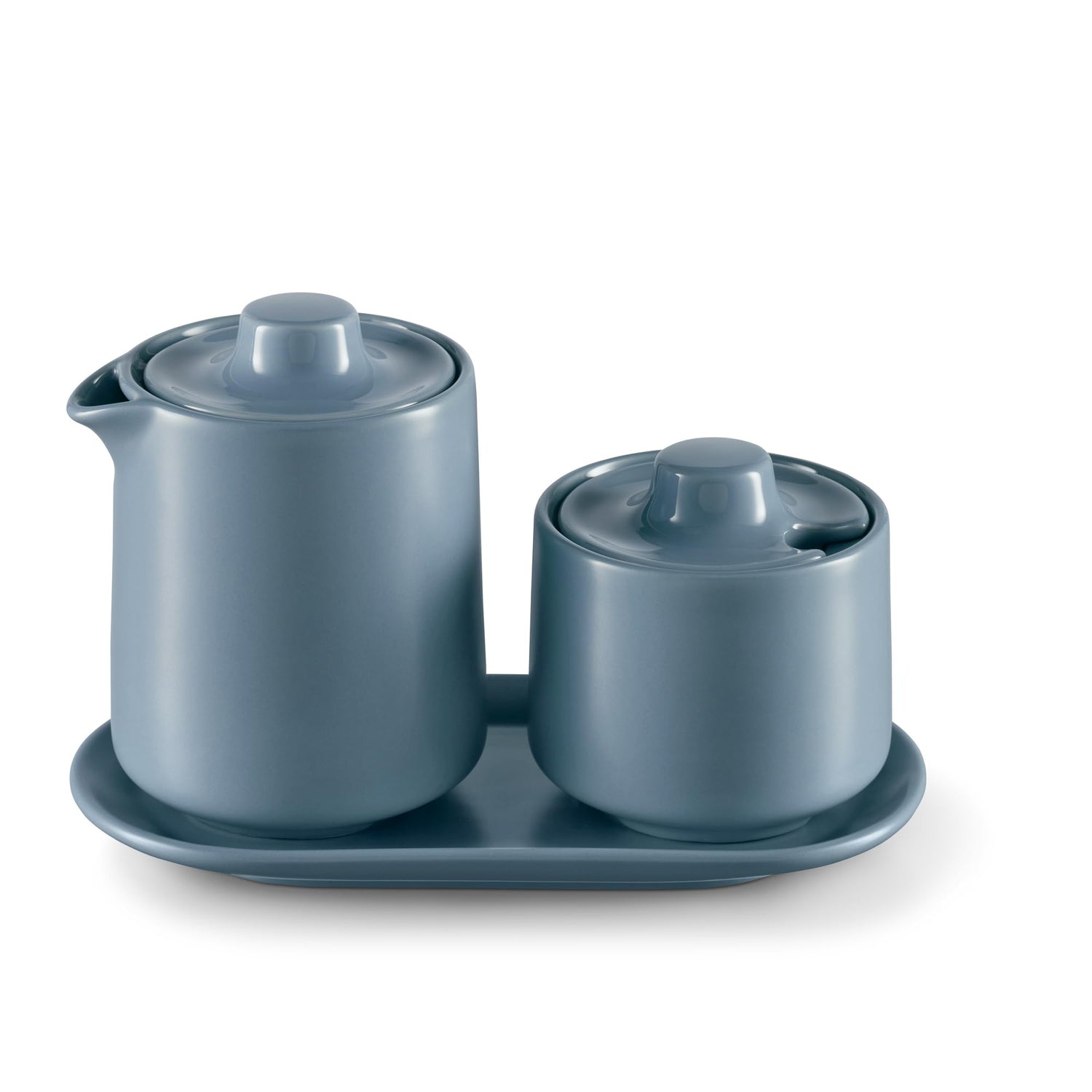 Tchibo Kaffeezubehör, Milch und Zucker-Set, Milchkännchen, Zuckertopf, Tablett, Porzellan (Blau)
