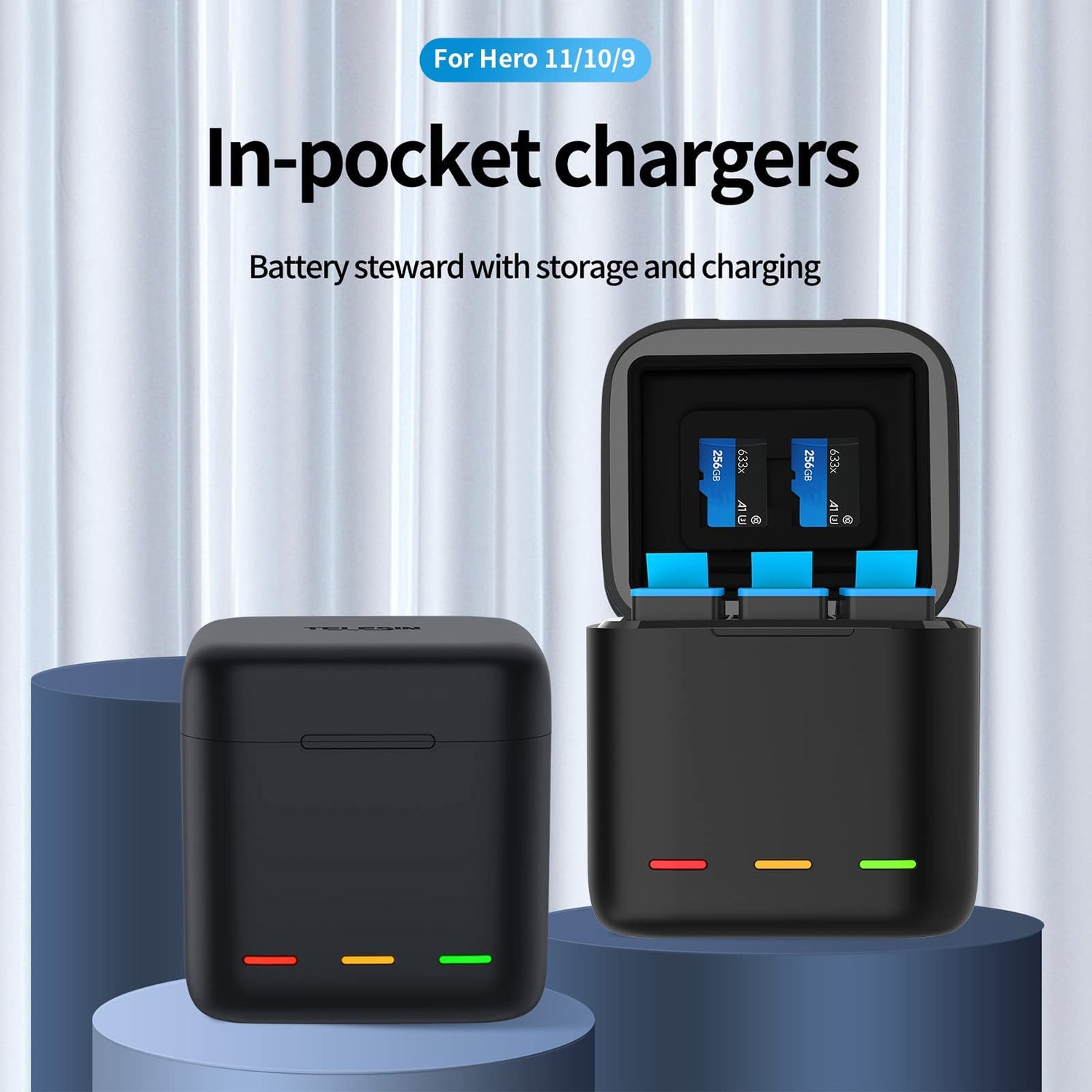 TELESIN Dreifach-Ladegerät und Akku-Speicherbox mit Ladegerät mit 3 Kanälen mit 2 Li-Ion-Akkus für GoPro Hero 12 Hero 11/10/9 Black (1 Ladegerät + 2 Akkus)