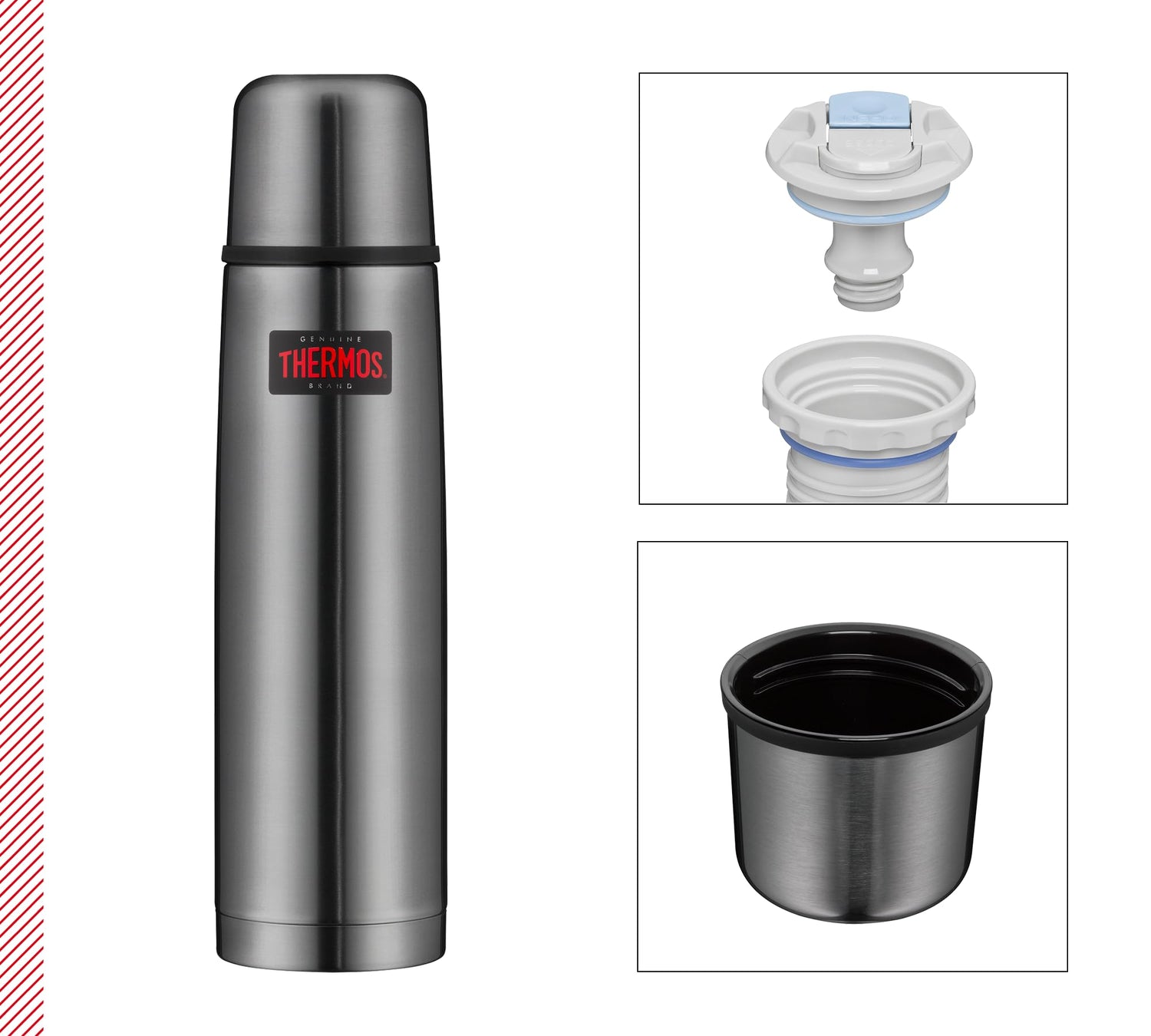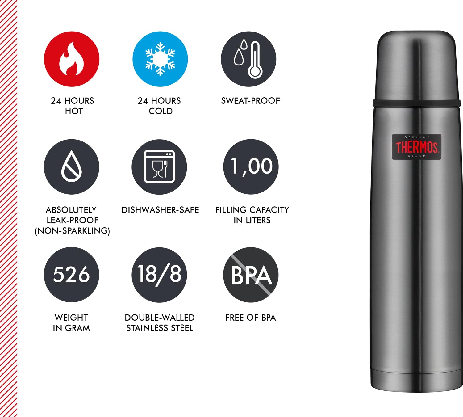 THERMOS LIGHT & COMPACT BEVERAGE BOTTLE 1l, stone grey, Thermosflasche Edelstahl, Isolierflasche grau mit Trinkbecher, 24 h heiß / 24 h kalt, spülmaschinenfest, absolut dicht, BPA-frei