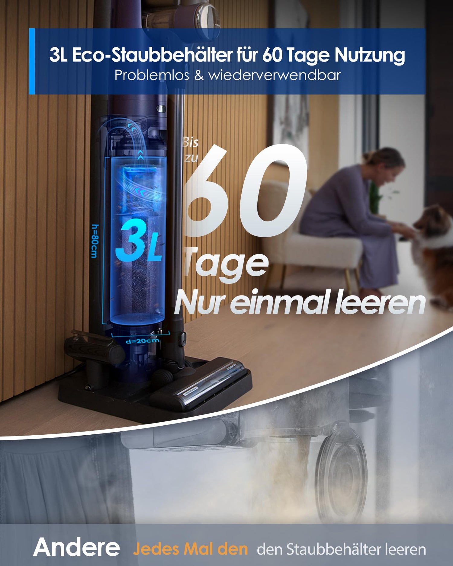 • 【3L Hohe Kapazität für bis zu 60 Tage】Die Absaugstation des Staubsaugers hat wiederverwendbare Staubbehälter mit einem Fassungsvermögen von 3 L. Es kann Ihrem täglichen Gebrauch bis zu 60 Tage lang genügen (wenn nasser Müll vorhanden ist, räumen Sie ihn bitte rechtzeitig auf).