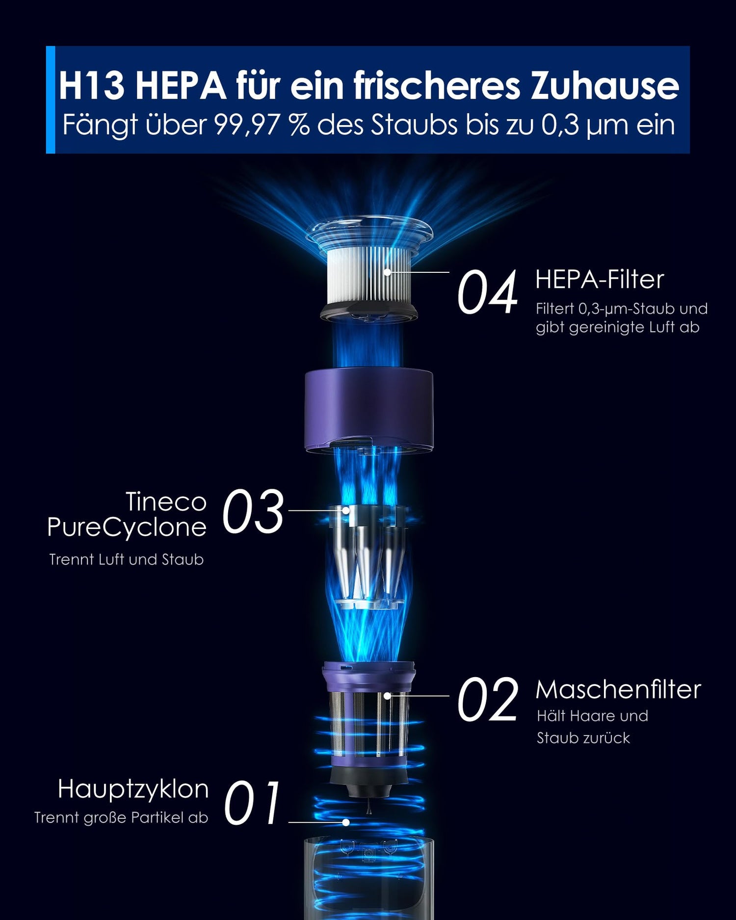 • 【4-Schichtige Filtration】Der Staubsauger ausgestattet 4 schichten Filtration, die eine Effizienz von bis zu 99,97% erreicht und garantiert ein saubereres Zuhause.