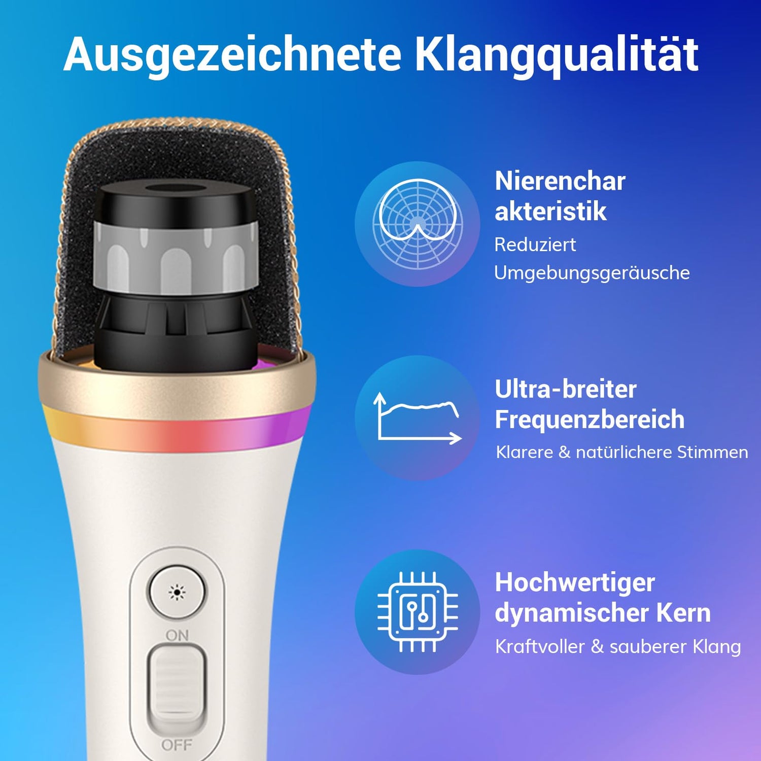 • Lebendige RGB-Lichter: Dieses dynamische Mikrofon verfügt über eine lebendige RGB-Beleuchtung mit vier Modi (Atmung, Zyklus, Gradient und Spektralfluss), um die perfekte Karaoke- und Partyatmosphäre zu schaffen. Drücken Sie kurz, um die Lichtmodi zu wechseln, und drücken Sie 2 Sekunden lang, um die Lichteffekte ein- und auszuschalten. Die Speicherfunktion bietet Ihnen zusätzlichen Komfort.