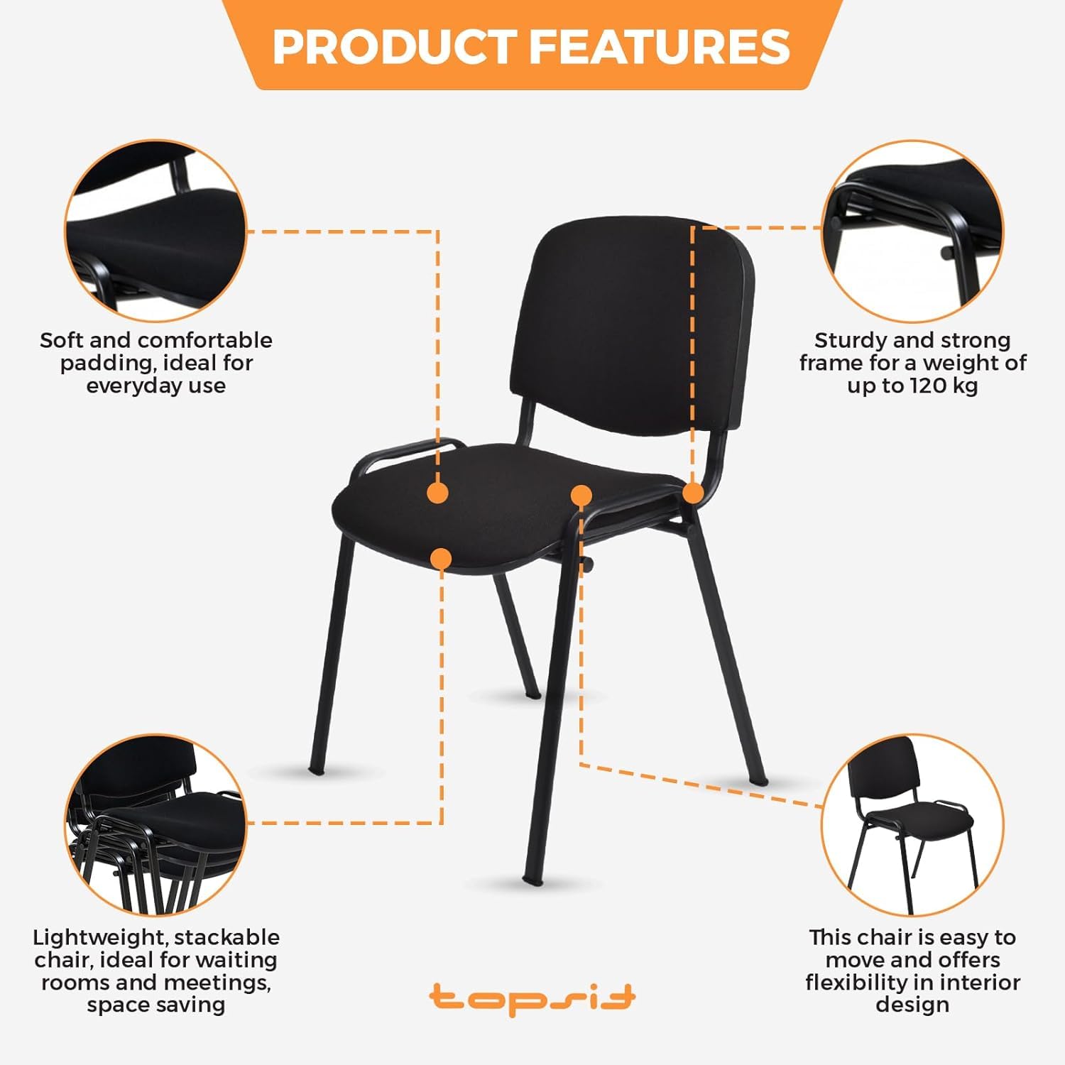 • Platzsparend stapelbar: Die Stühle lassen sich mühelos stapeln und platzsparend verstauen, was sie perfekt für Veranstaltungen, Konferenzen oder Räume mit begrenztem Platz macht und die Reinigung erleichtert.