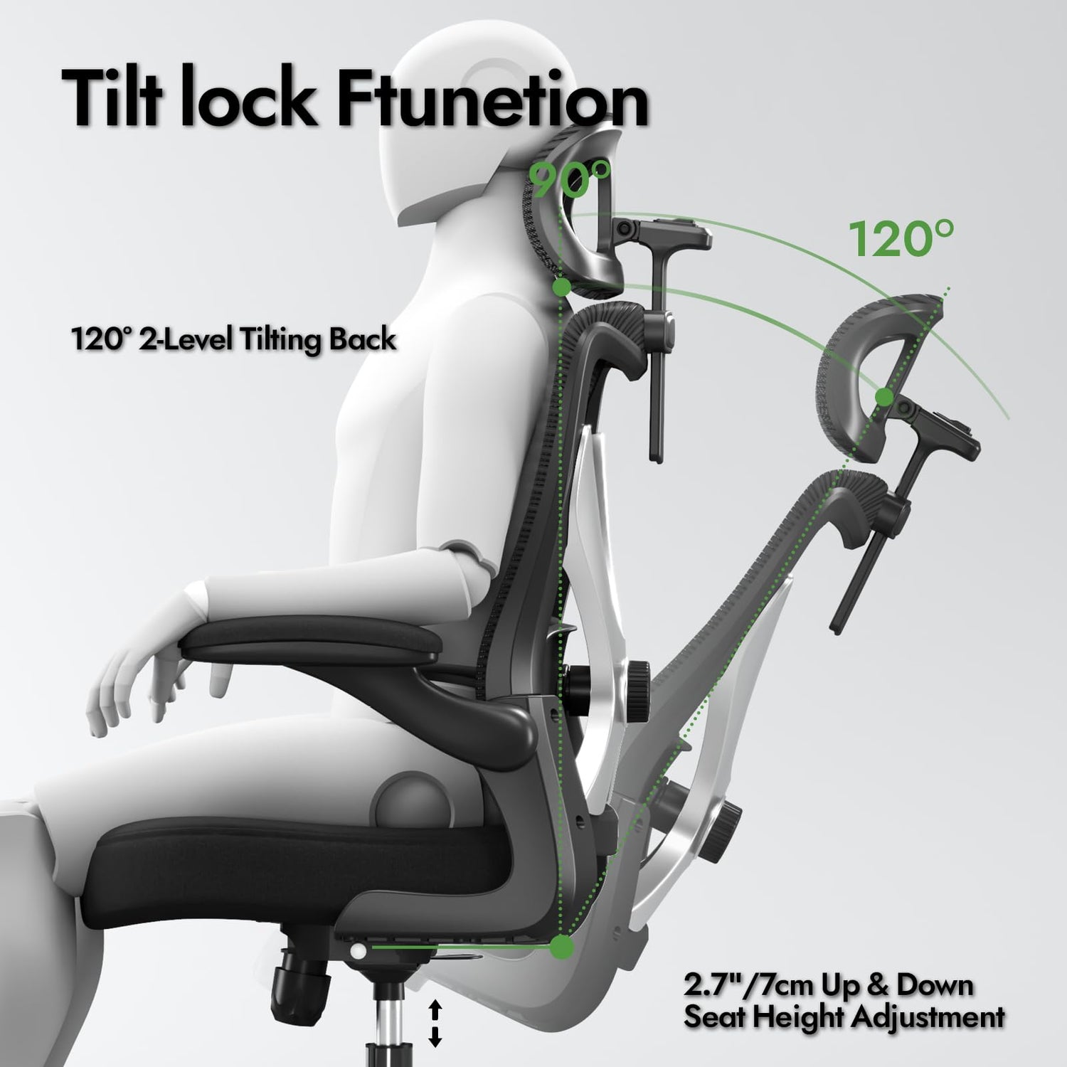 • Ergonomischer Bürostuhl: Erleben Sie beispiellose Unterstützung mit unserem ergonomischen Bürostuhl, entworfen, um umfassende Unterstützung für Ihren Kopf, Rücken, Hüften und Arme zu bieten. Maßgeschneiderte Lendenwirbelstütze sorgt für Ihren Komfort und Wohlbefinden. Geeignet für Personen von ca. 5'5" bis 6'2". Sitzhöhe, Kopfstütze, Rückenlehne und aufklappbare Arme lassen sich leicht anpassen, um den unterschiedlichsten Bedürfnissen gerecht zu werden und bieten bequemen Halt während längerer Sitzzeiten