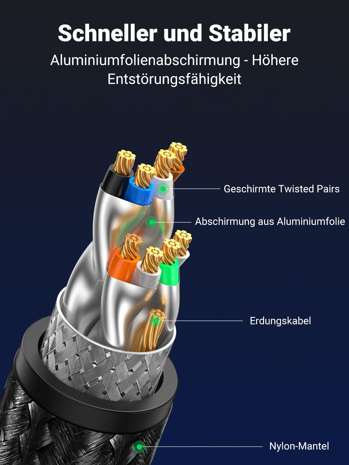 • Doppelte Abschirmung für Anti-Störung: Das Ethernet Kabel verfügt über inneren Kupferleiter und FTP Abschirmung (mit paarweisen verdrillten Adern und Gesamtmetallfolie). Im Vergleich zu Cat 7 und Cat 6 Kabel bietet unser Cat 8 Netzwerkkabel den besseren Schutz gegen äußere elektromagnetische Störeinflüsse an.