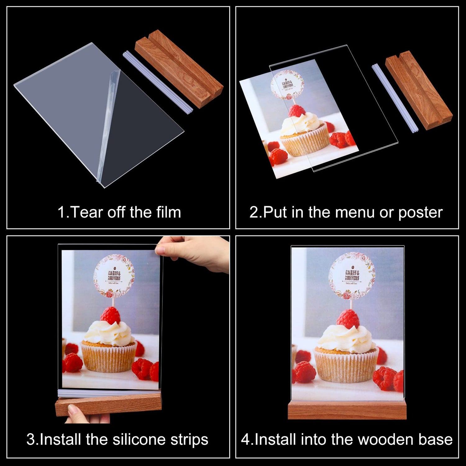 • Doppelseitiger Transparenter Displayhalter:Der T-förmige Schildhalter kann auf beiden Seiten angezeigt werden, klar und transparent auf beiden Seiten,wodurch Werbung,Poster,Logos,Zertifikate,Fotos und Restaurantmenüs effektiv angezeigt werden.Entfernen Sie vor dem Gebrauch die Schutzfolie,bringen Sie den Klebestreifen an und setzen Sie dann die Holzbasis ein,damit Sie die kompletten durchsichtigen Schilderhalter aus Kunststoff erhalten.