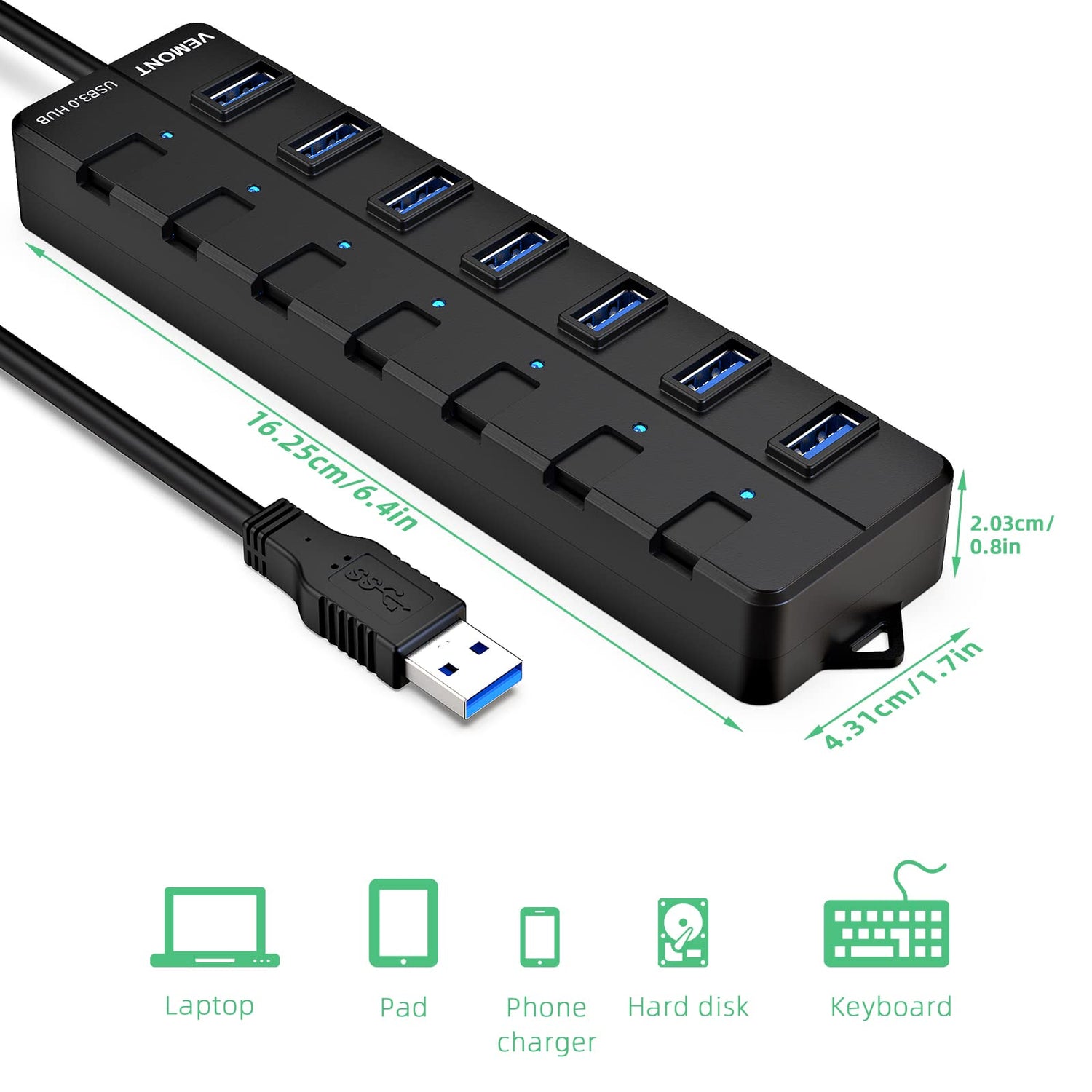 USB 3.0 Hub, VEMONT 7-Port USB Hub USB Splitter mit verlängertem 1.2m Kabel, USB Verteiler mit einzelnen LED Power Schalter für PC/MacBook Air/Pro/Mac Mini/iMac/MacPro/Laptops und weitere USB Geräte