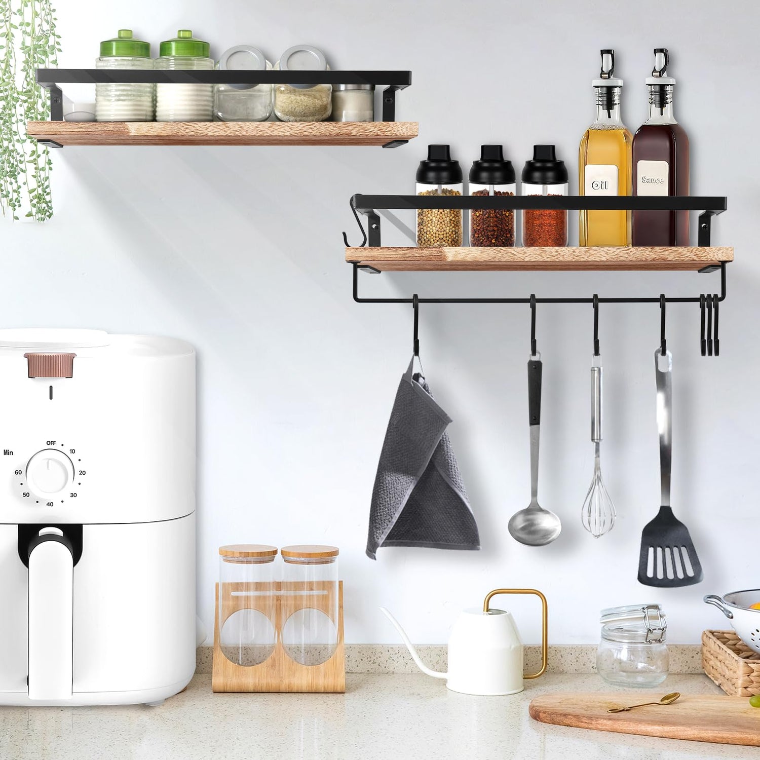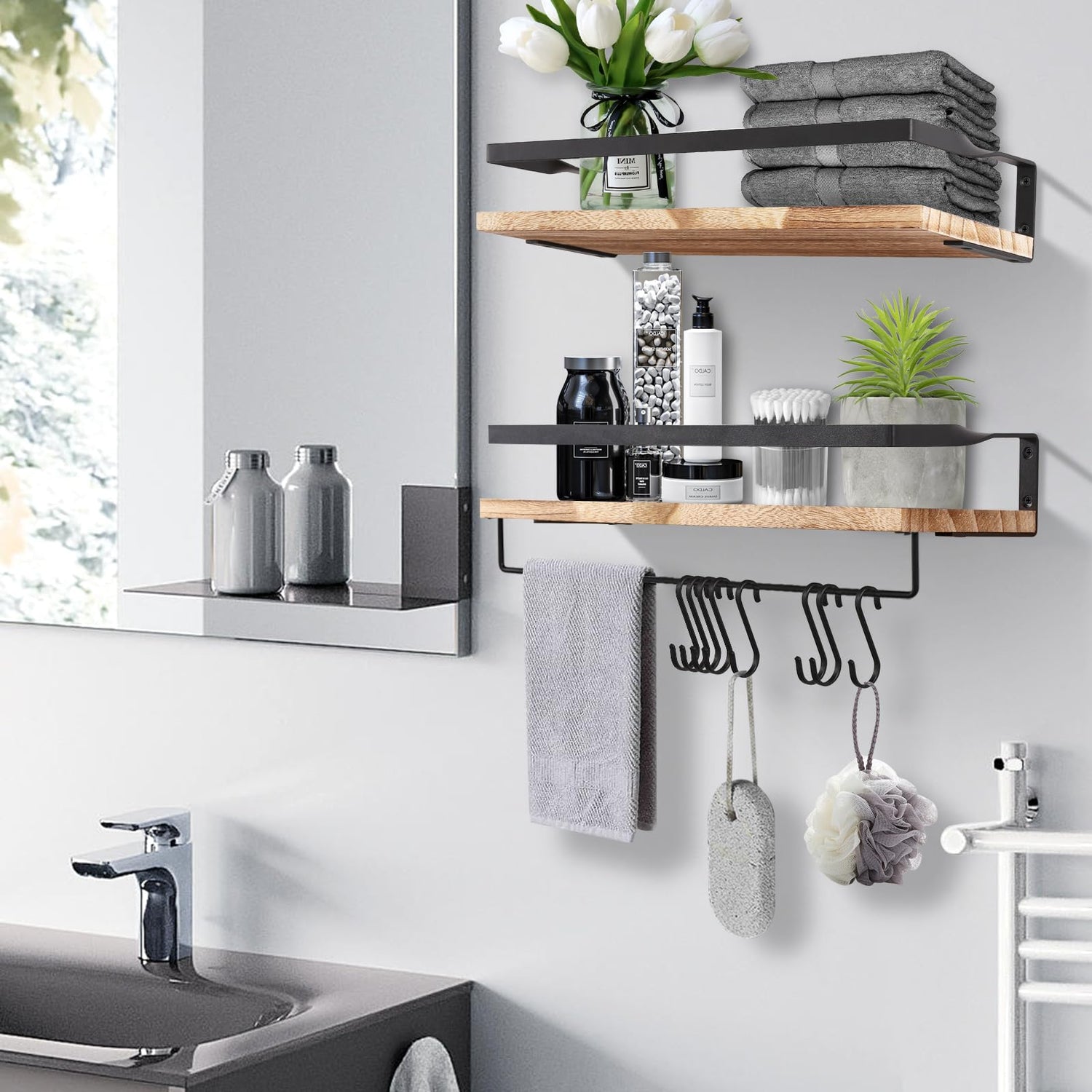 • 【Schützendes Konstruktion Design】 Uten Schweberegal rustikal, das Funktionalität und Schönheit vereint, bietet ein gutes Preis-Leistungs-Verhältnis. Das Design des Metallrahmens verringert die Möglichkeit, dass Gegenstände herunterfallen. Der abnehmbare Handtuchhalter macht diesen Wandregal noch flexibler