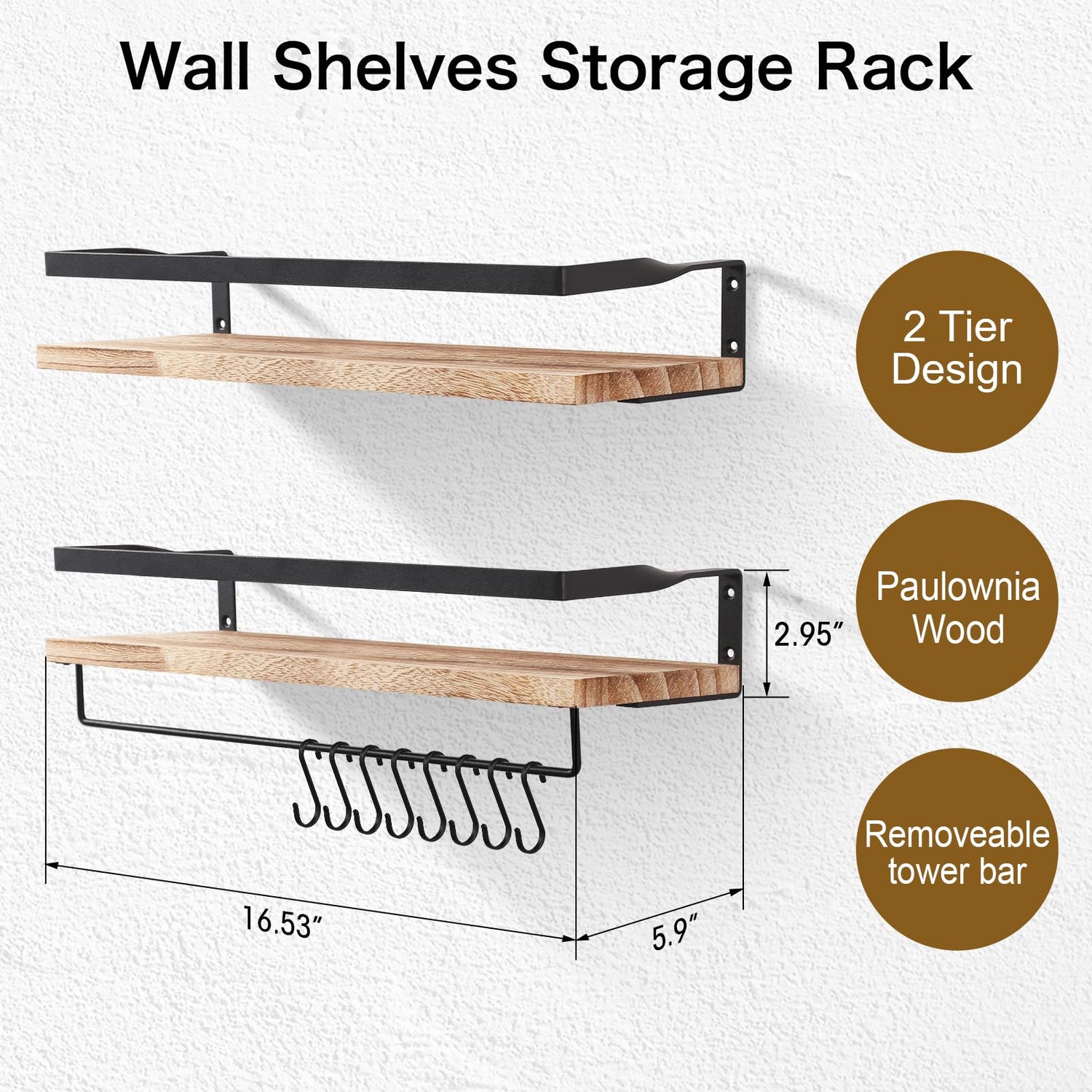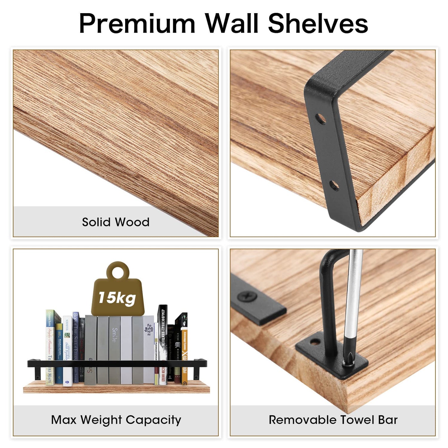 Uten Wandregal Holz, Schweberegal Rustikal mit Handtuchhalter 2er Set Hellbraun für Schlafzimmer, Wohnzimmer, Badezimmer, Küche, Büro