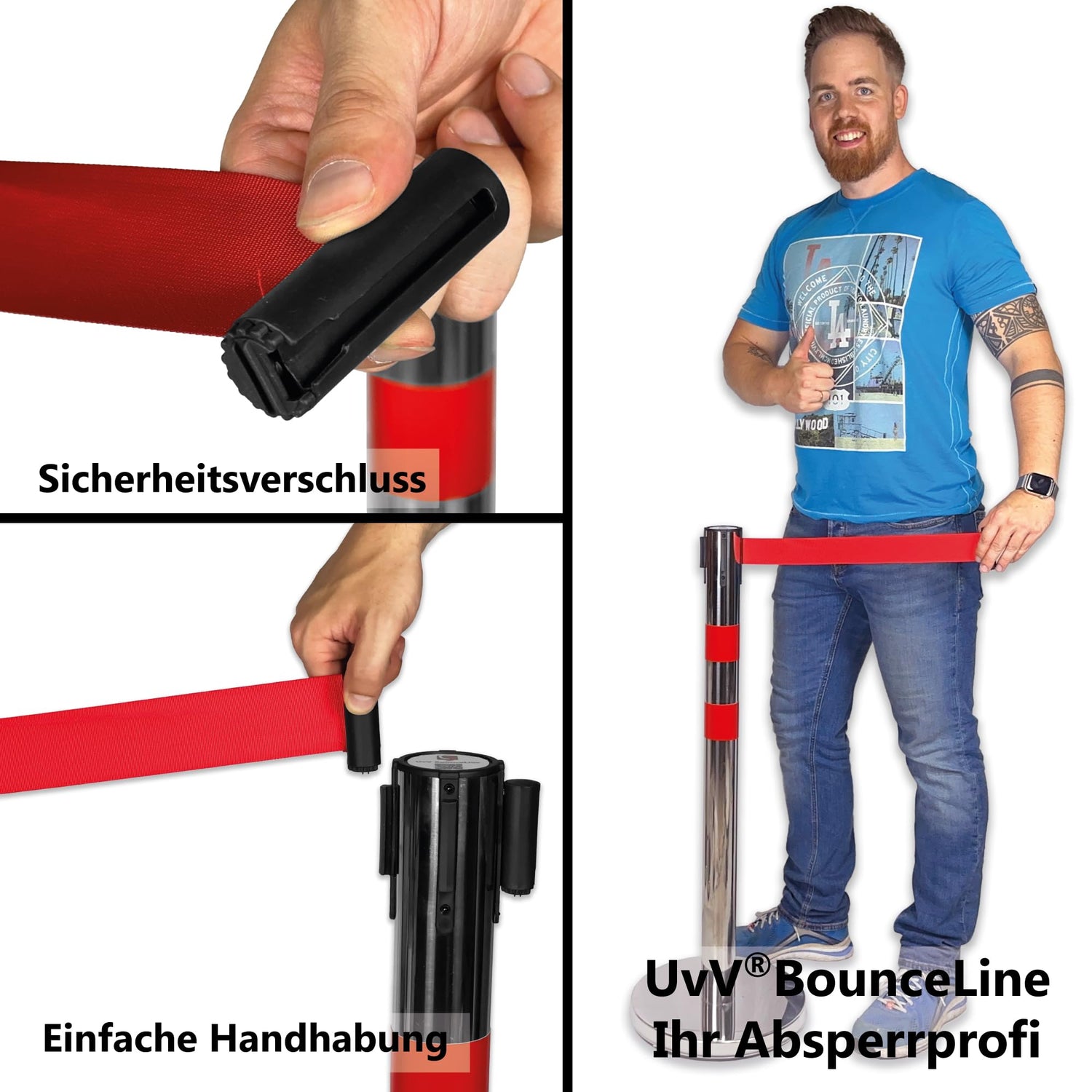 Einzelheiten: Das UvV BounceLine Personenleitsystem aus Edelstahl ist eine robuste und elegante Lösung für die Besucherlenkung in Ihrem Unternehmen. Es besteht aus zwei 90 cm hohen Edelstahlpfosten mit einem bis zu 3 m langen Gewebeband. Das Basic-Modell kann bis zu 2 m gespannt werden und hat einen 6 kg schweren Fuß für Stabilität. Das Heavy-Modell ist mit 8 kg Gewicht pro Pfosten noch stabiler und kann bis zu 3 m ausgezogen werden. Die Pfosten sind aus hochwertigem Edelstahl gefertigt und der Fuß besteht aus zwei Teilen: einer Edelstahlabdeckung und dem Gewicht. Dieses System ist ideal für den Einsatz in Empfangsbereichen, Ausstellungen oder Veranstaltungen, um Warteschlangen und Besucherströme geordnet zu lenken. Mit seiner robusten Konstruktion und dem eleganten Design fügt es sich nahtlos in jede professionelle Umgebung ein.
