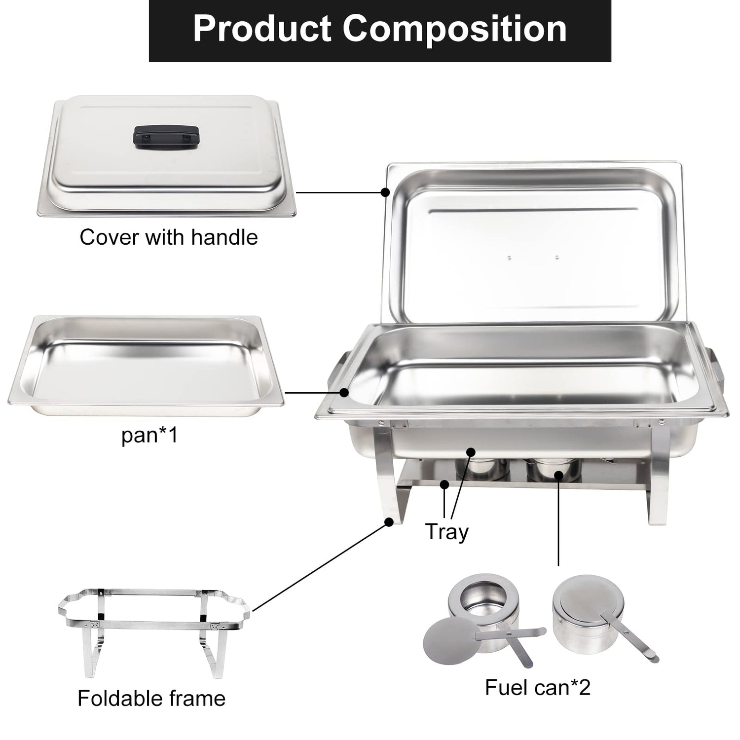 • Komplettes Zubehör-Set: Der Chafing Dish wird mit 4 Sicherheitsbrennstoffdosen mit vollen Deckeln (Brennstoff ist nicht enthalten), 2 Brennstoffhalterschalen, 2 klappbaren Rahmen, zwei 9L Pfannen in voller Größe, 2 Wasserschalen, 2 Deckeln mit Griff, einem Schaumlöffel und einer Servierzange geliefert. Die Chafers und Buffetwärmer sind außerdem mit Griffen ausgestattet, damit das Produkt leicht bewegt werden kann.