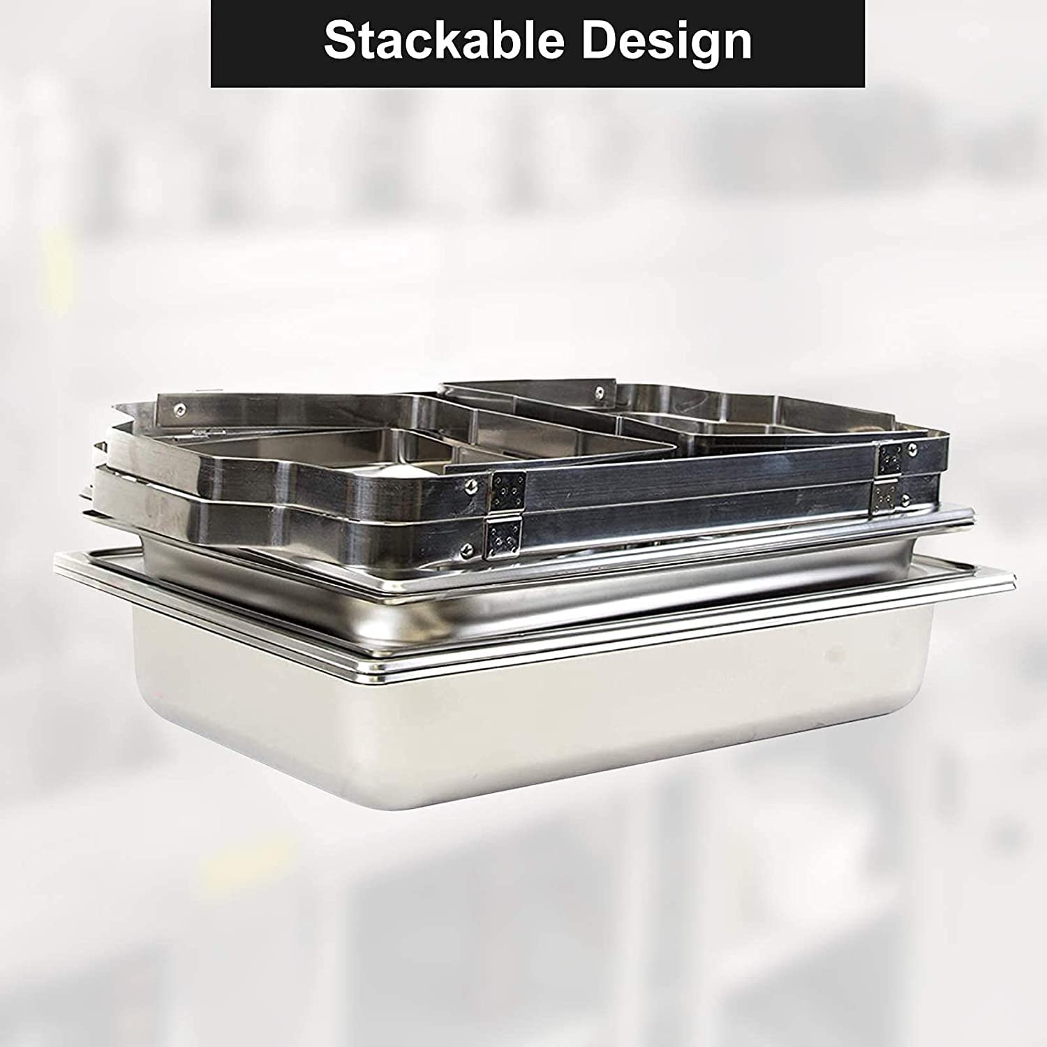 • Hält die Temperatur der Speisen aufrecht: Das Gestell der Speisenwärmer verfügt über eine Bodenwanne mit 2 Brennstoffhaltern zur Aufbewahrung von Brennstoffen zum Erhitzen von Speisen. Sie können auch Eis in die Wasserschale legen, wenn Sie die Speisen abkühlen möchten. Die Brennstoffverbrennung hält warm und der Eiswürfel frisch.