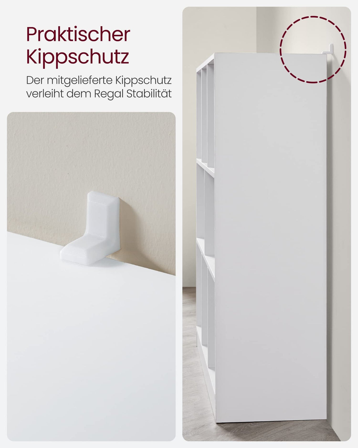 • Robuste Konstruktion: Hergestellt aus hochwertigen Spanplatten, trägt jede Ebene bis zu 15 kg. Kippschutz-Sets sorgen für zusätzliche Stabilität und Sicherheit in Wohn- oder Büroräumen.
