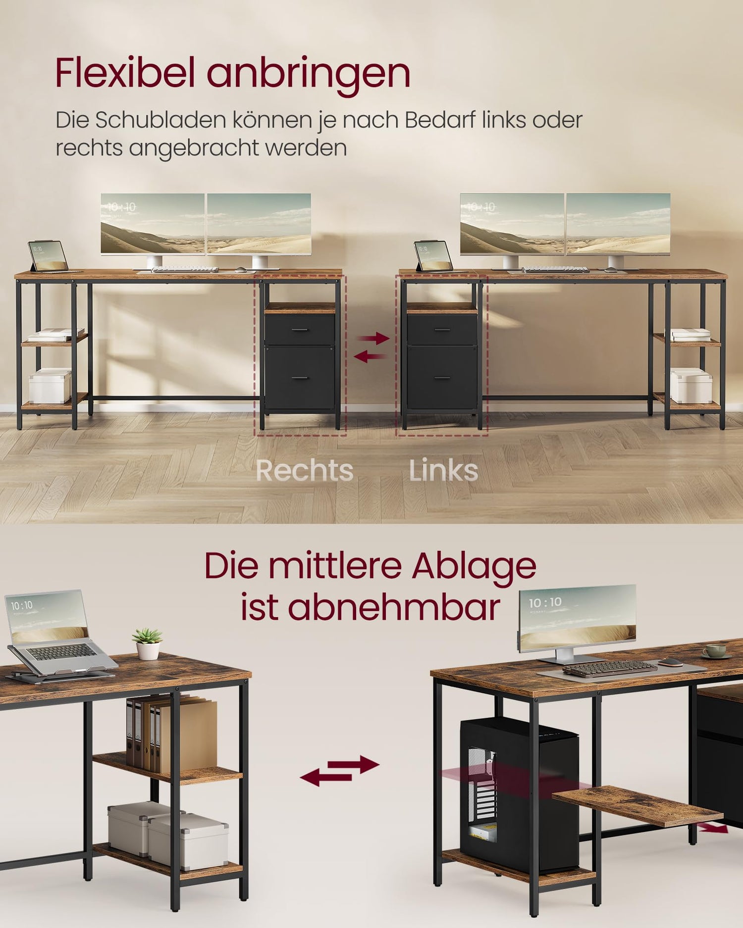 • Flexible Montage: Die Schubladen können links oder rechts angebracht werden; die mittlere Ablage ist abnehmbar, mit der Ablage für Ihre Bücher oder Dokumente, ohne die Ablage für Ihren Computer-Tower