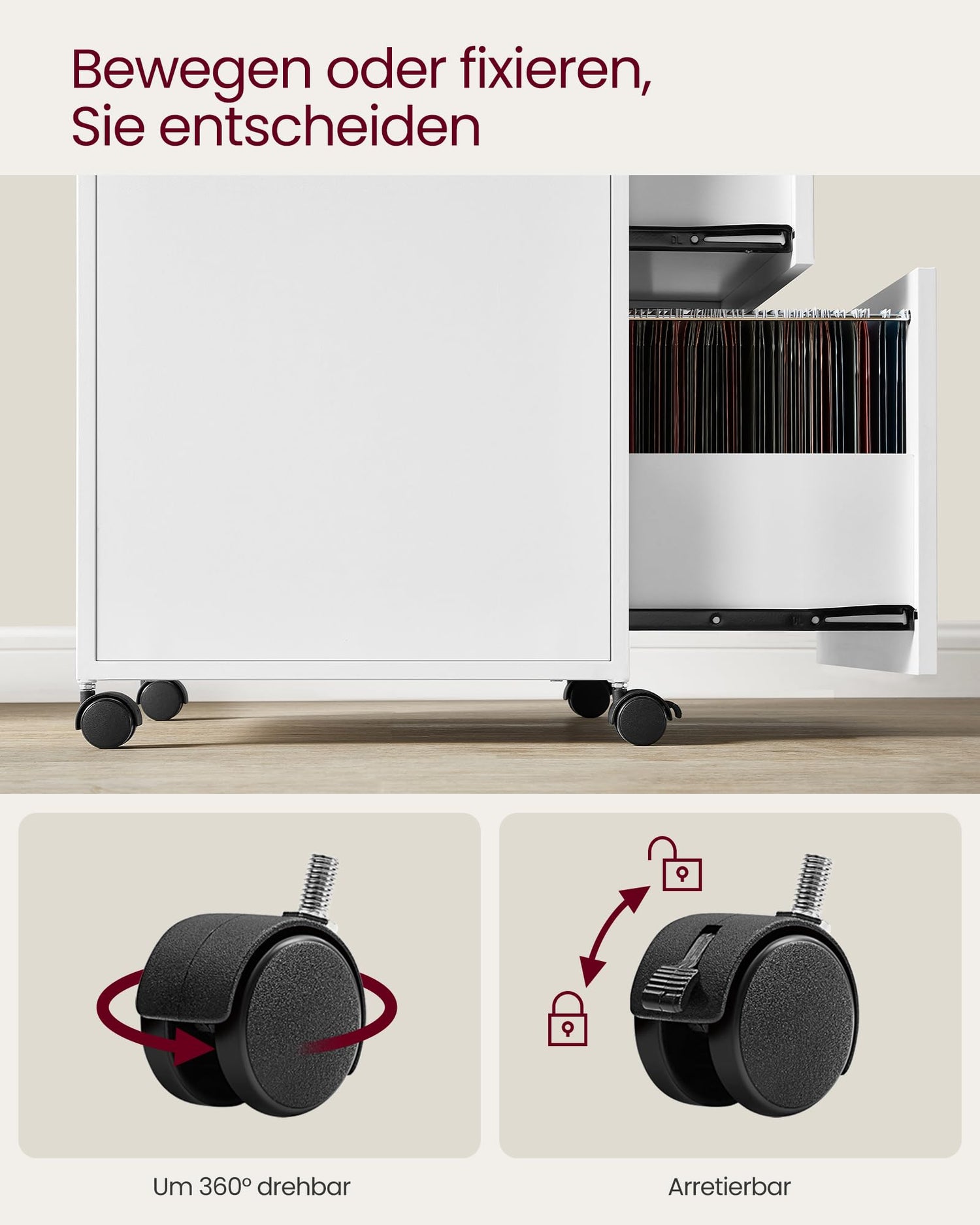 VASAGLE Rollcontainer, Aktenschrank mit 2 Schubladen, mobiler Büroschrank mit Rädern, offenes Fach, Hängeregistratur, Stahlgestell, modern, wolkenweiß OFC071W14