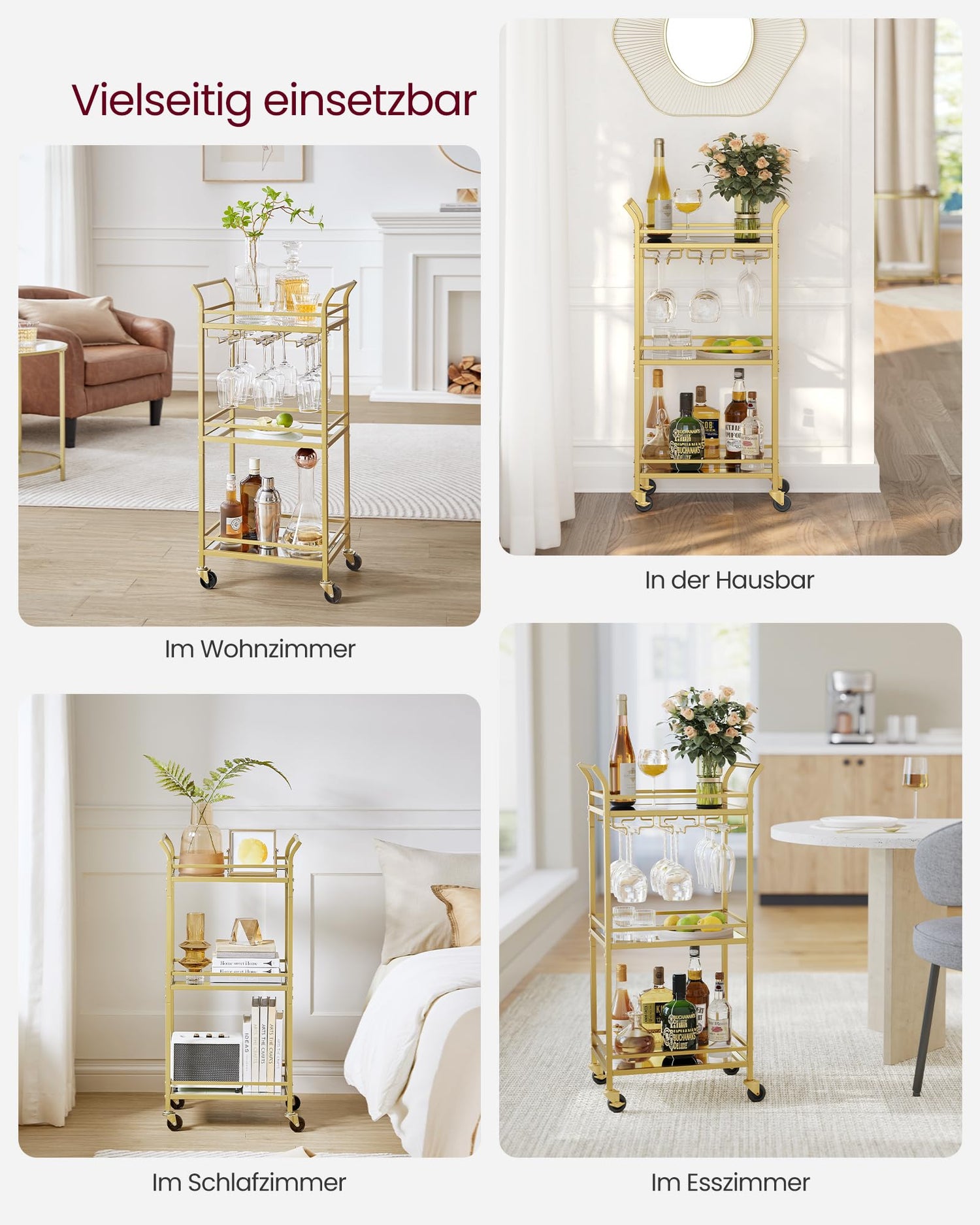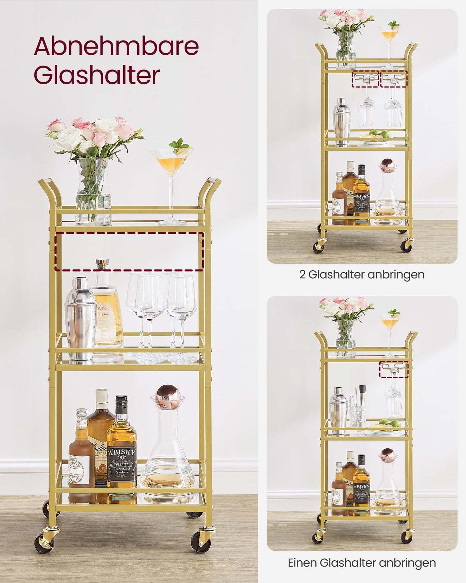 VASAGLE Servierwagen, 3 Ebenen, Rollwagen, mit Rollen, Griffen, verspiegelte Glasablagen, für kleine Räume, Küche, Esszimmer, Bar, goldfarben LRC091A62