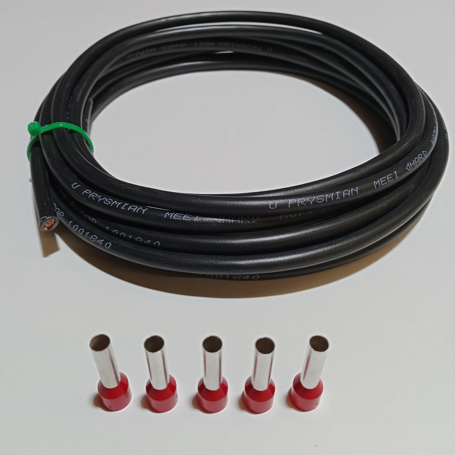 Set besteht aus der Verdrahtungsleitung in ausgewählter Länge und Farbe, sowie 5x 10mm² Aderendhülsen in 19mm Länge nach DIN