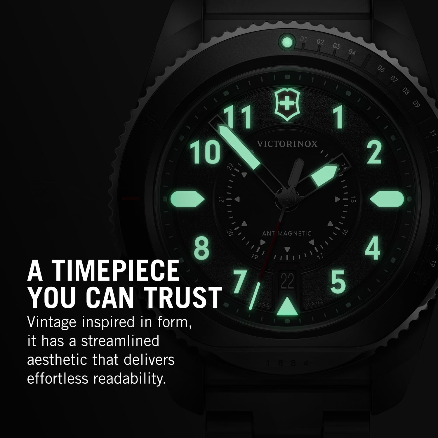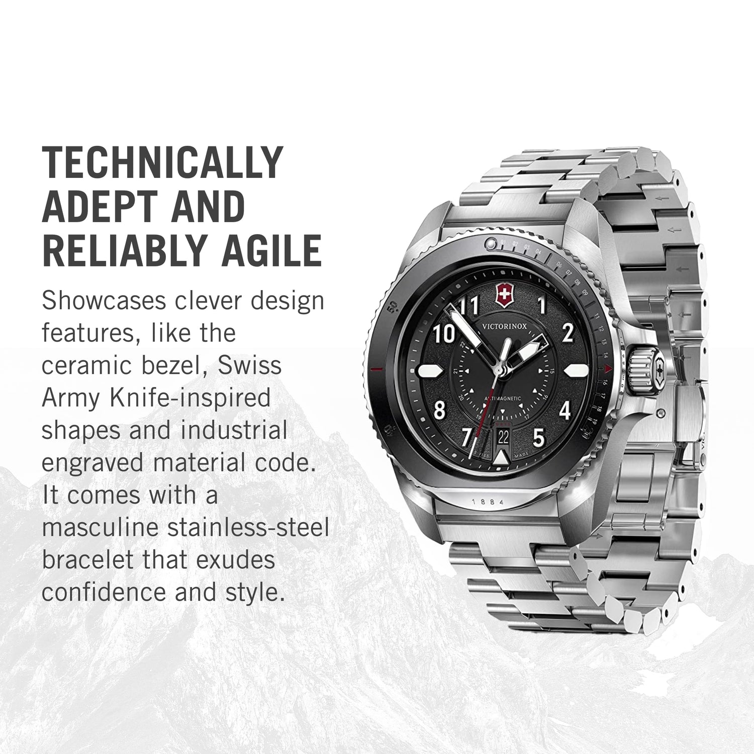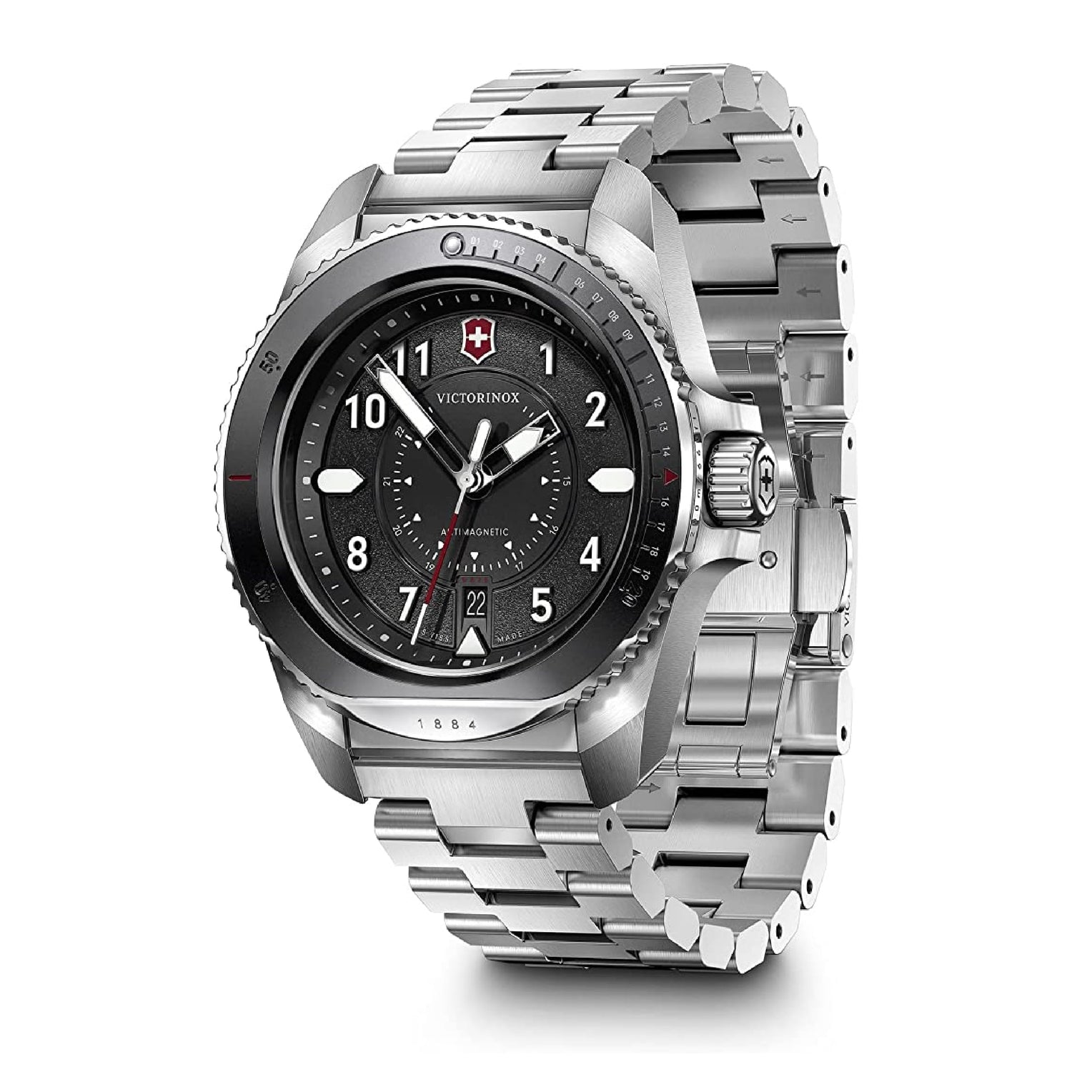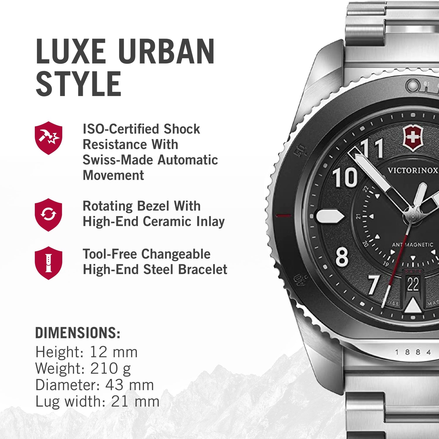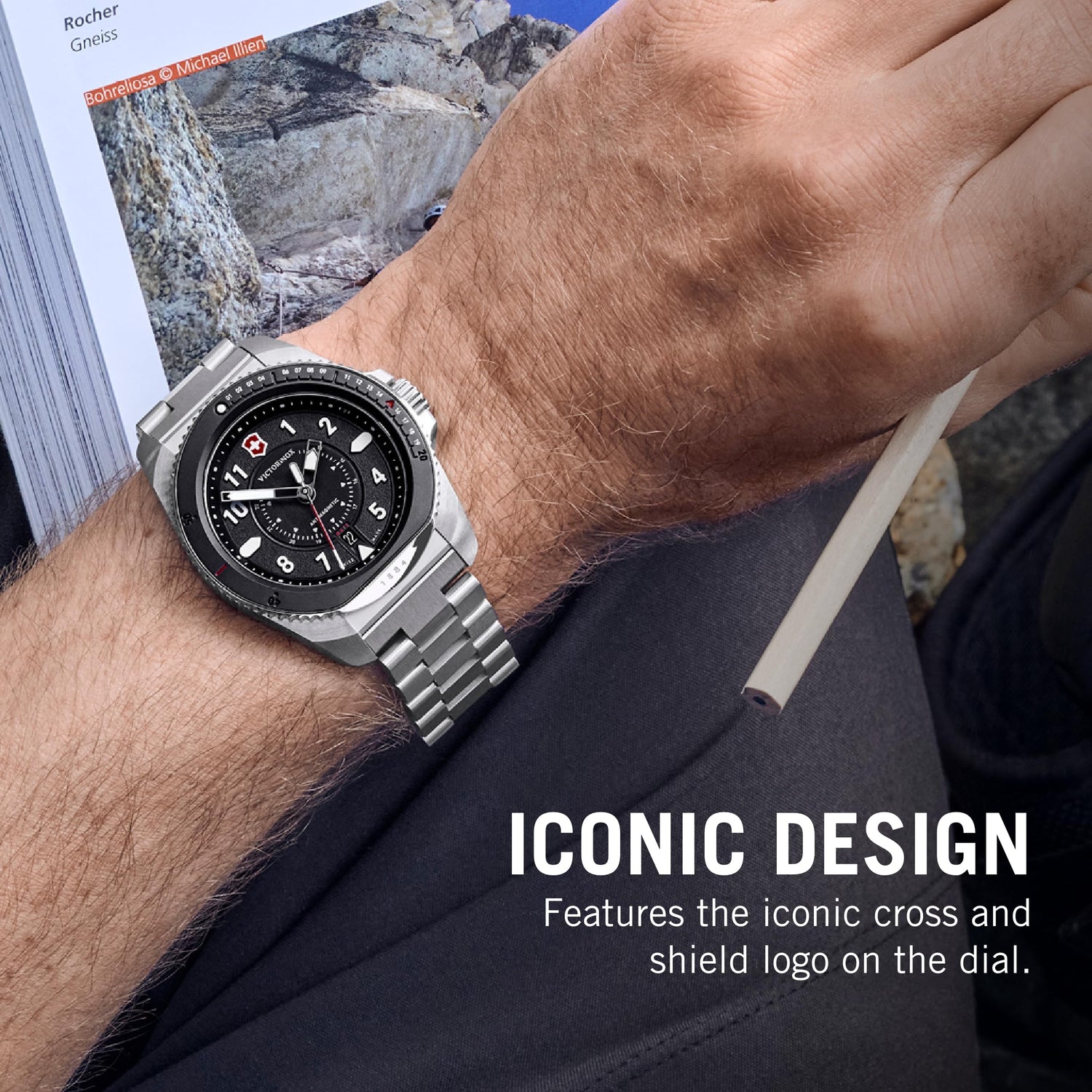 Victorinox Herren Armbanduhr Journey 1884 Ø 43 mm, Swiss Made, Analog Quarz, Wasserdicht bis 200 m, Edelstahl-Armband, Schwarz/Silber