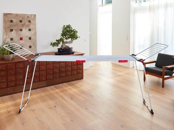 • HOHE FLÜGEL: Auf dem Wäschetrockner mit 30 m Trockenleine finden 2-3 Wäscheladungen Platz. Dank hoher Flügel lassen sich lange Wäschestücke wie Hosen trocknen, ohne dass sie den Boden berühren