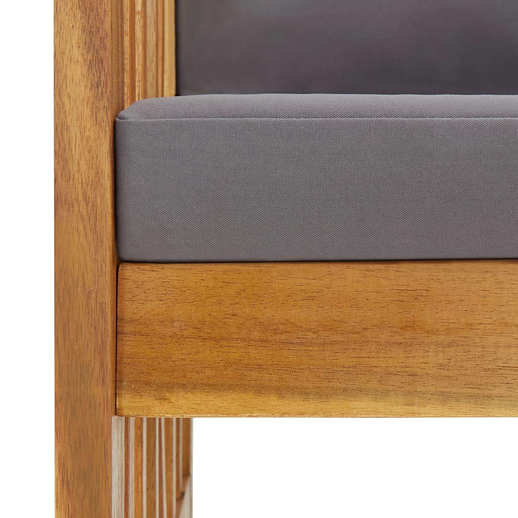 Einzelheiten: Das hölzerne Garten-Lounge-Set bringt einen Vintage-Look in Ihren Garten, Ihre Terrasse oder andere Außenbereiche! Das Gartenmöbel-Set besteht aus einer massiven Akazienholzkonstruktion mit Ölfinish und ist somit stabil und langlebig. Die dicken Sitz- und Rückenkissen sorgen für ein weiches Sitzgefühl. Dank der Massivholz-Tischplatte mit Lattendesign bietet der Couchtisch Platz für Snacks, Obstkörbe, Dekorationsgegenstände und andere wichtige Sachen. Die leicht gebogene Rückenlehne und die Armlehnen erhöhen den Sitzkomfort der Bank und des Stuhls. Wichtiger Hinweis: Farben und Maserung variieren von Möbelstück zu Möbelstück, was jedes Sideboard einzigartig macht. Die Lieferung erfolgt nach dem Zufallsprinzip. Polsterfarbe: Dunkelgrau Material: Akazien-Massivholz, mit Öl behandelt Tischabmessungen: 102 x 50 x 43 cm (L x B x H) Bankabmessungen: 119 x 67 x 83 cm (L x B x H) Stuhlabmessungen: 59 x 67 x 83 cm (B x T x H) Bank-Sitzgröße: 110 x 84,5 cm (B x T) Stuhl-Sitzgröße: 50 x 48,5 cm (B x T) Bank-/Stuhl-Sitzhöhe vom Boden: 34 cm Zusammenbau erforderlich: Ja Lieferung enthält: 2 x Gartenstuhl 1 x Gartenbank 1 x Couchtisch 4 x Sitzkissen 4 x Rückenkissen Maximal 110 kg pro Sitzplatz.
