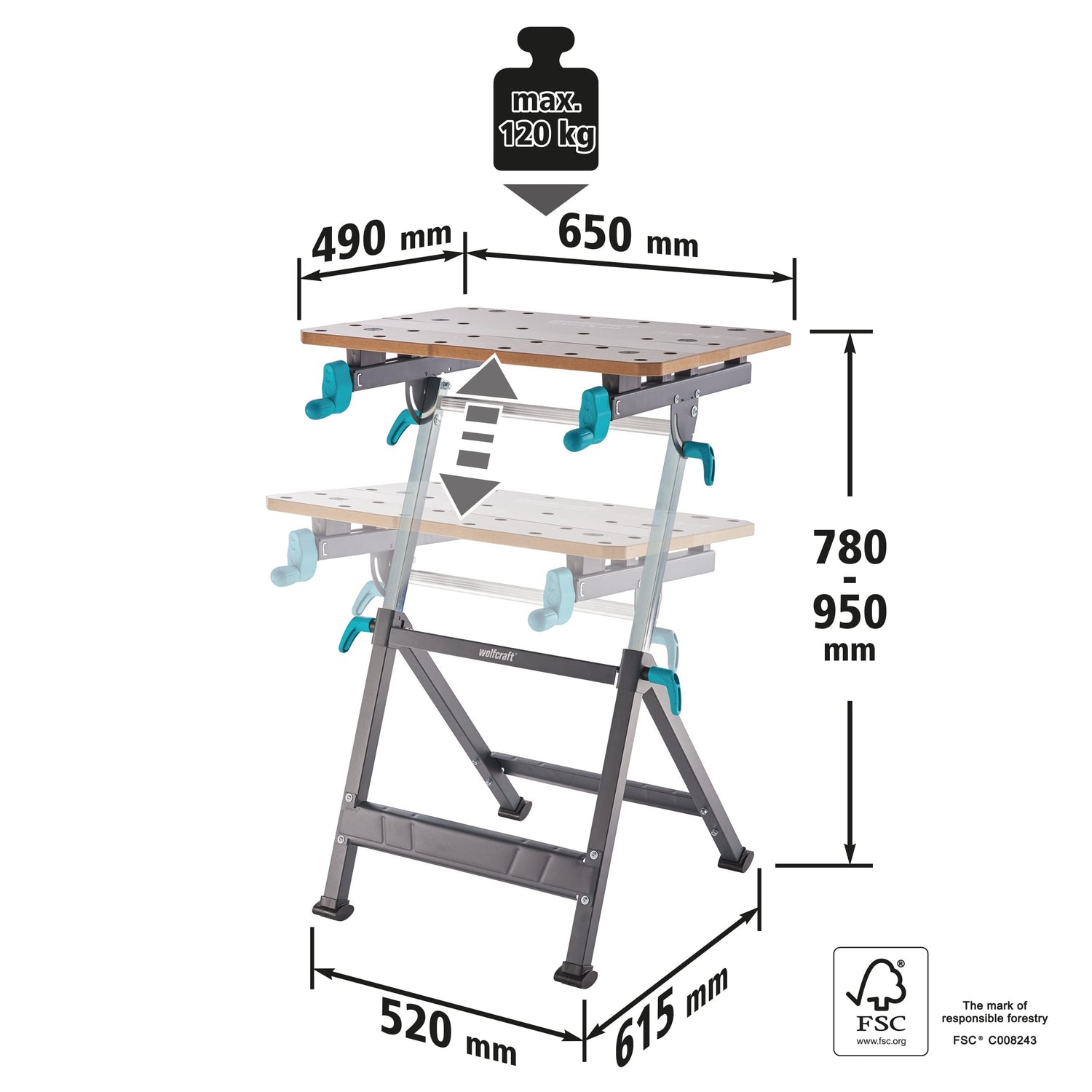 wolfcraft Spann- und Arbeitstisch Master 650 Ergo - 6870000 - stufenlos höhenverstellbar - zusätzliches Einlegebrett zum Erweitern der Arbeitsfläche - mobil einsetzbar - Made in Europe