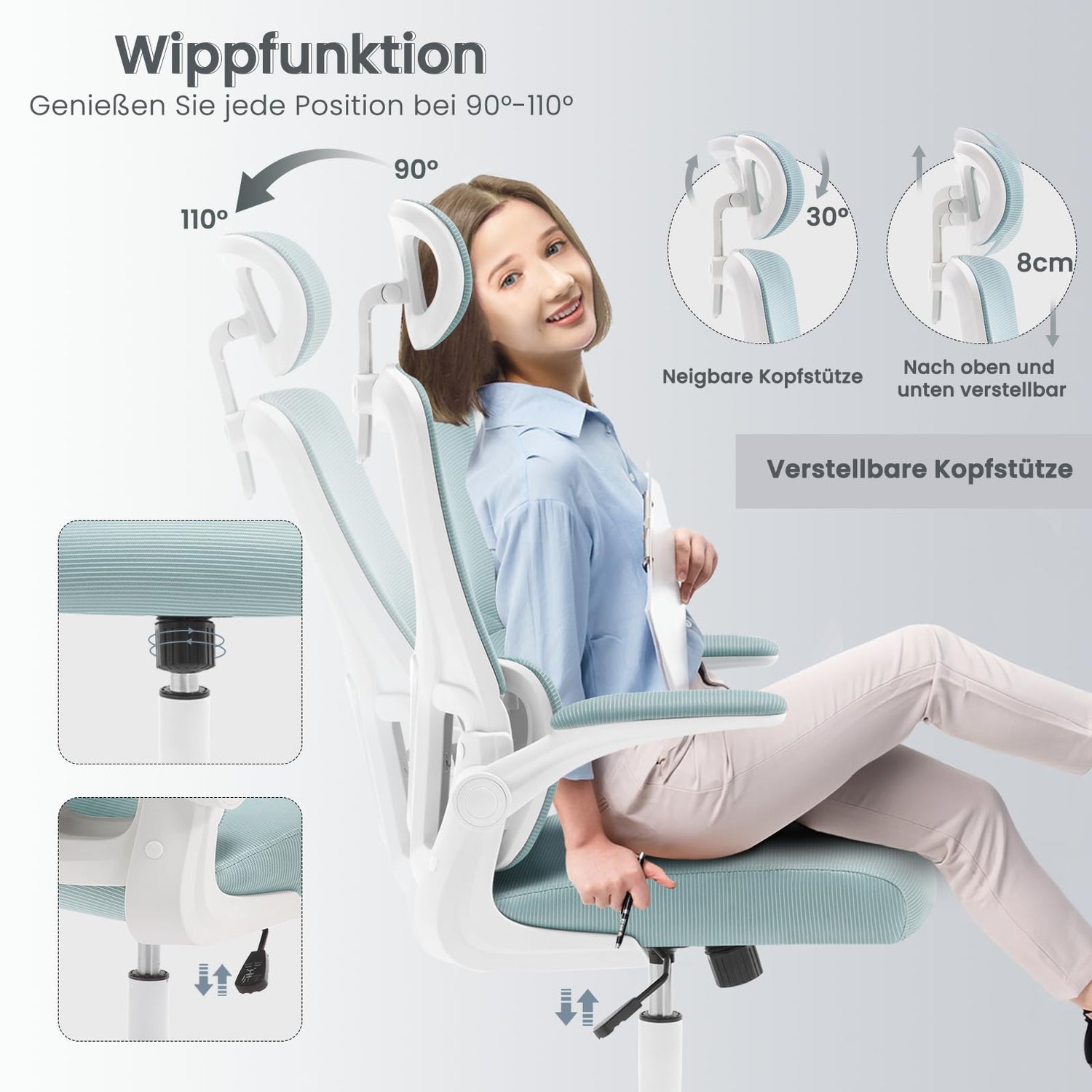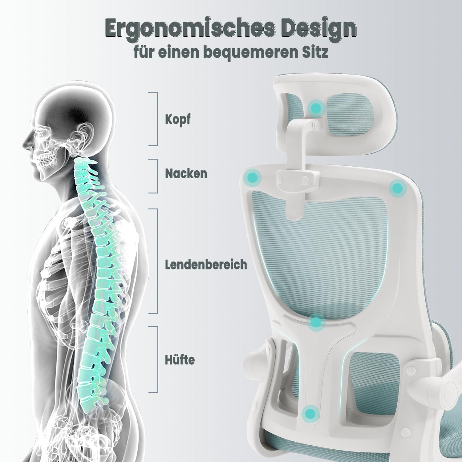 • Ergonomisches Design: Hohe Netz-Rückenlehne mit integrierter Lendenwirbelstütze passt sich der Wirbelsäule an und fördert eine gesunde Haltung. Kopfstütze unterstützt den Nacken beim Zurücklehnen, die Schaukelfunktion sorgt für zusätzliche Entspannung.