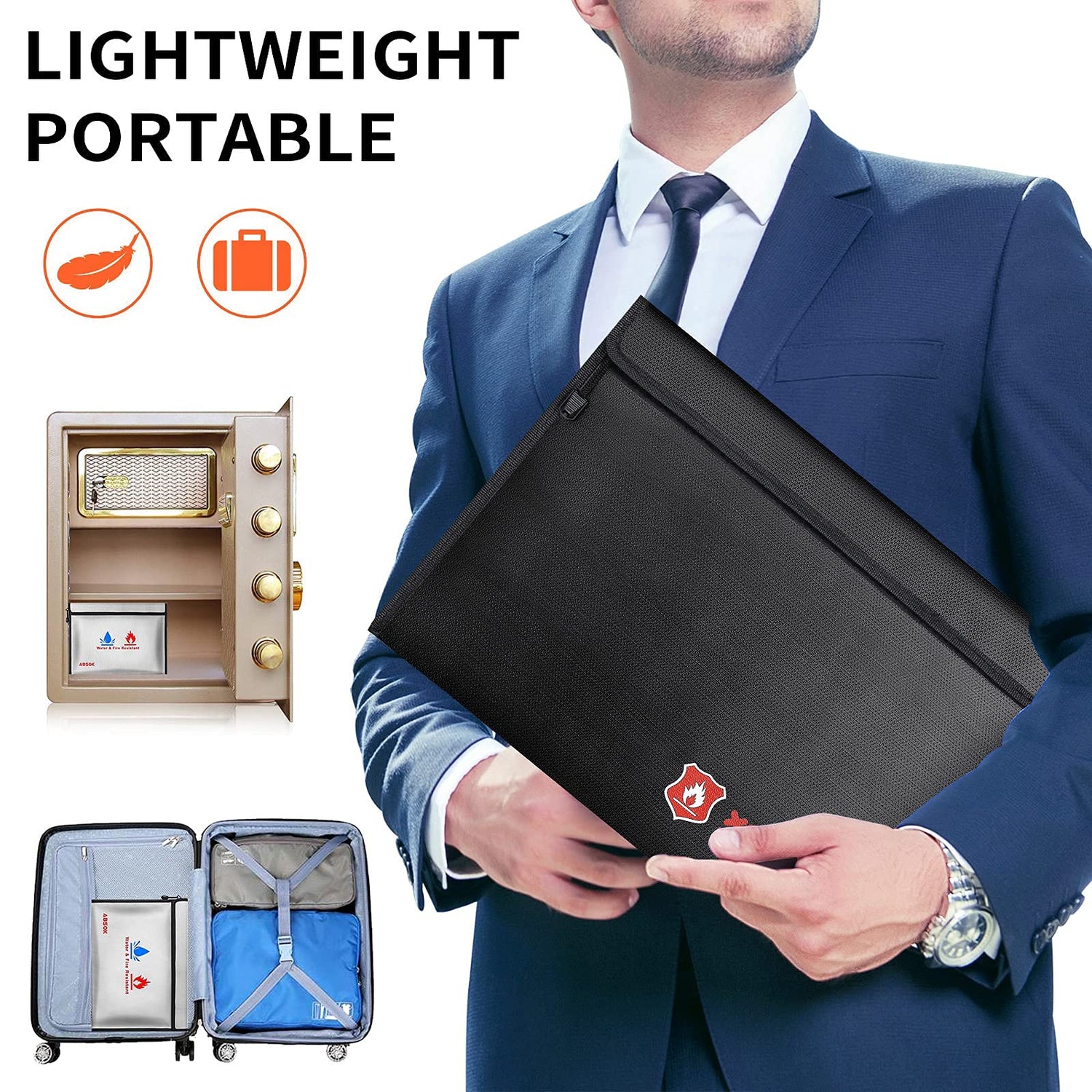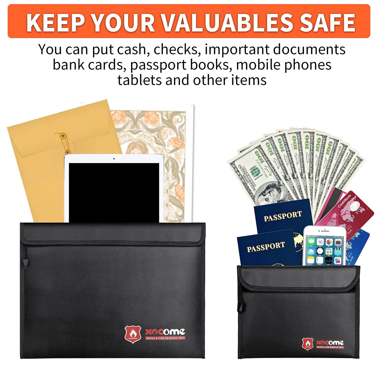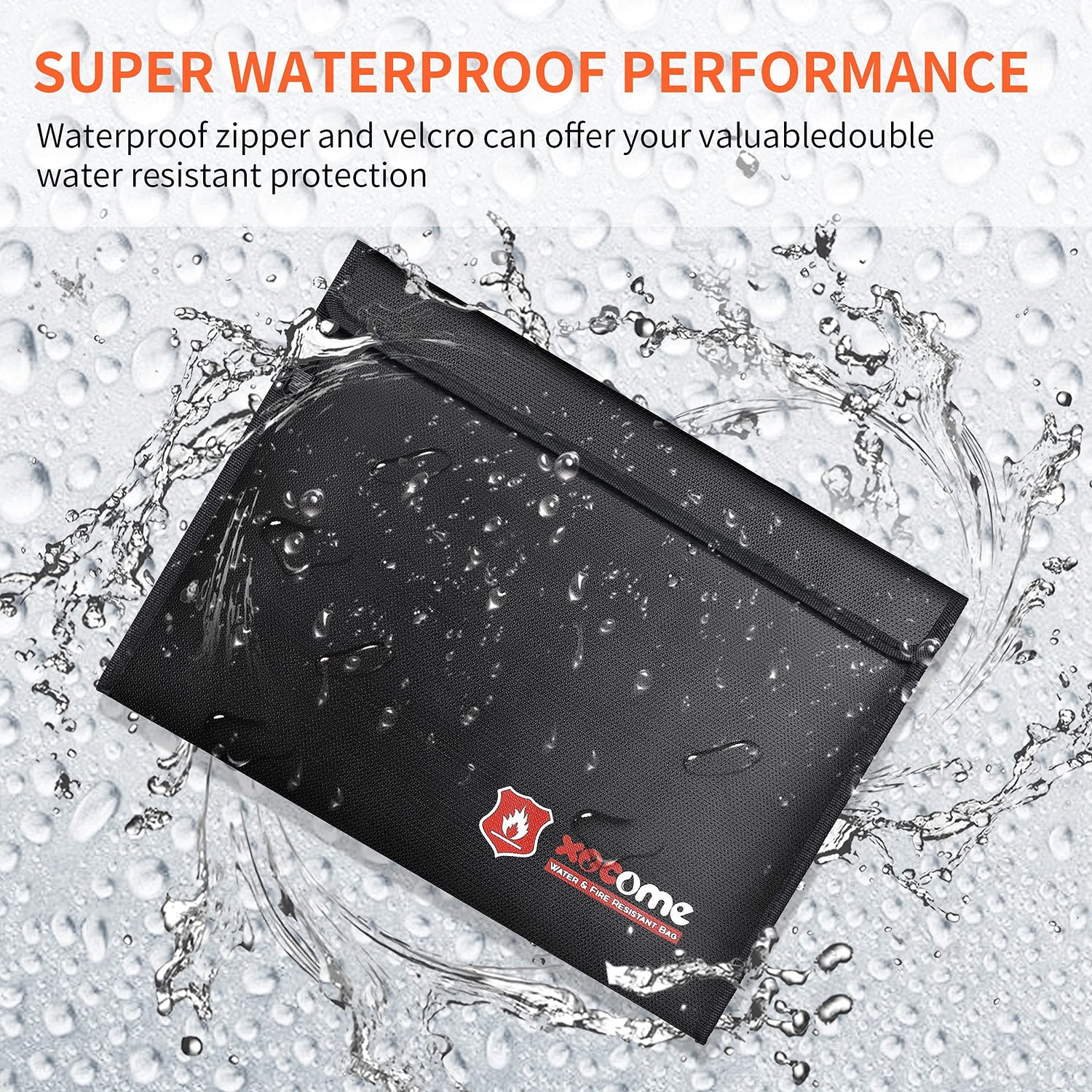 xocome 2 Stück Feuerfeste und wasserdichte Tasche(38x28cm, 23x17.5cm) Zweilagigen Glasfasermaterial, Feuersichere wasserdichte Aktentasche für A4 Dokumente, Passport Bankdatei Geld Wertsachen(Schwarz)