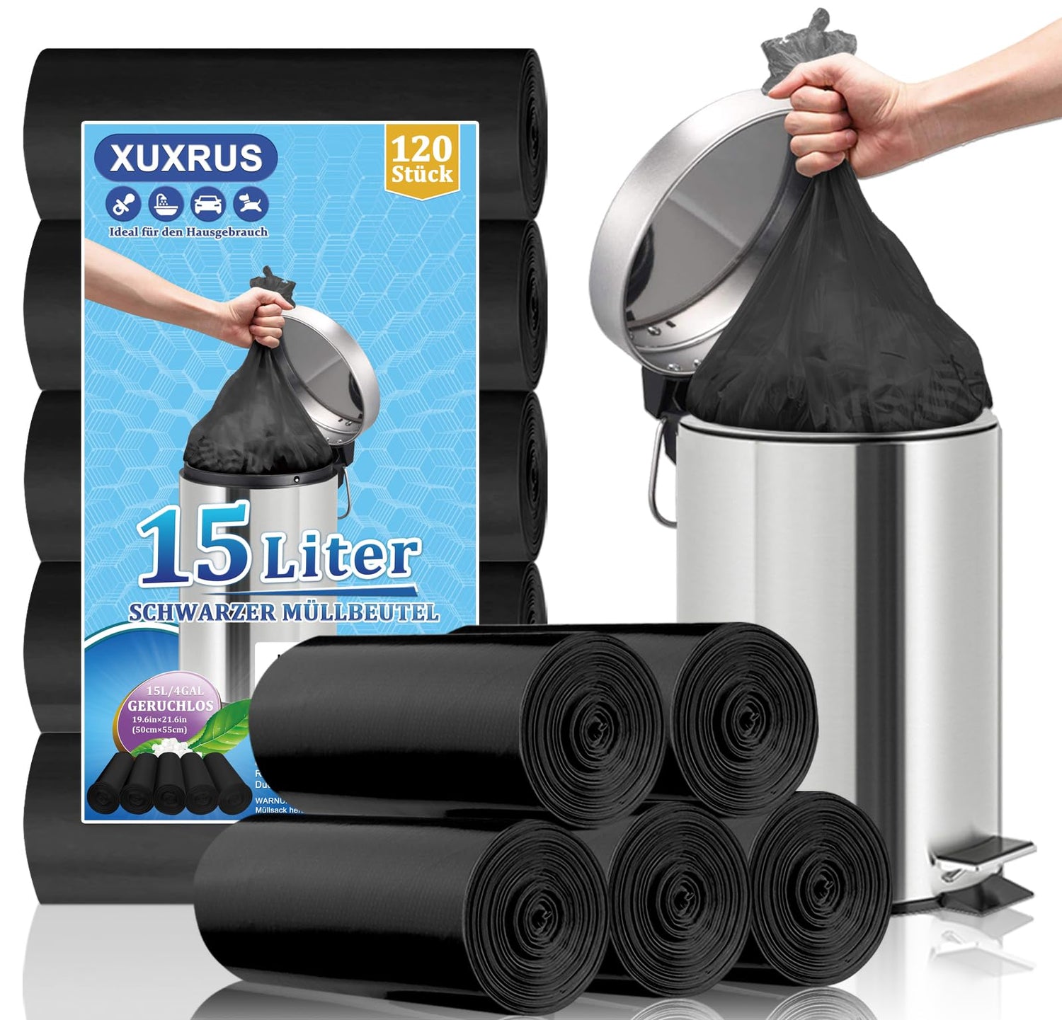 XUXRUS Müllbeutel 15L Müllsäcke Schwarze Mülltüten Kleine Reißfest Abfallbeutel Geeignet für Badezimmer,Toiletten und Küchen,120 Stück