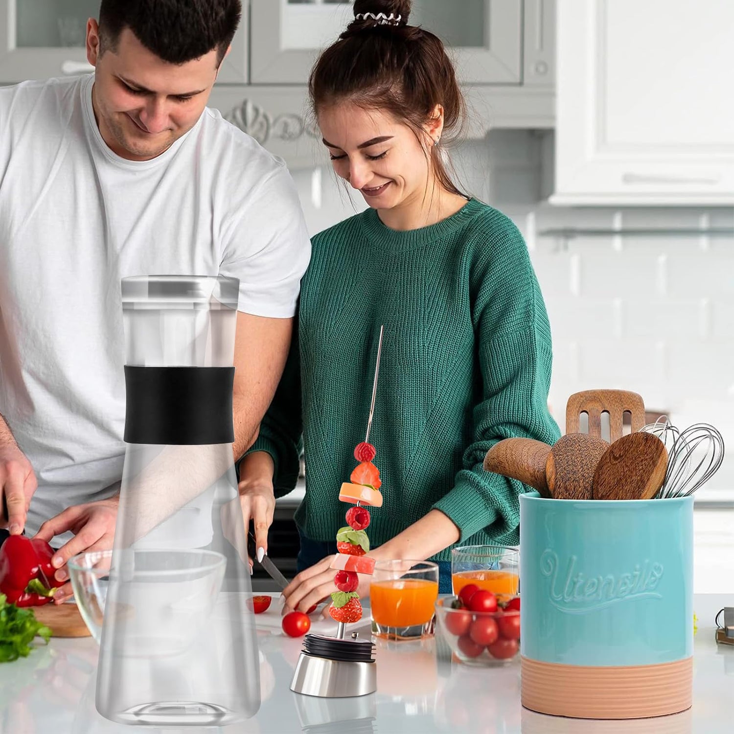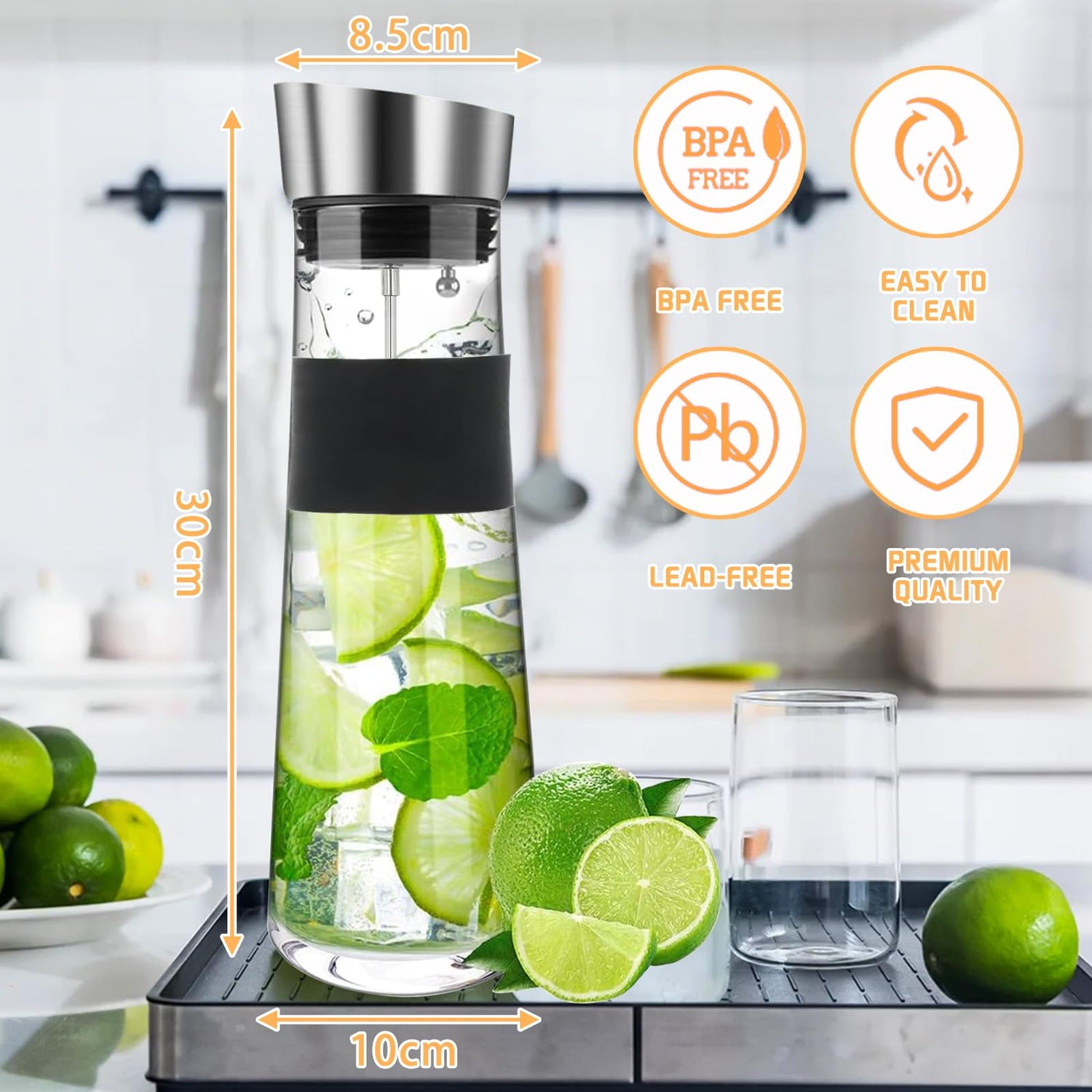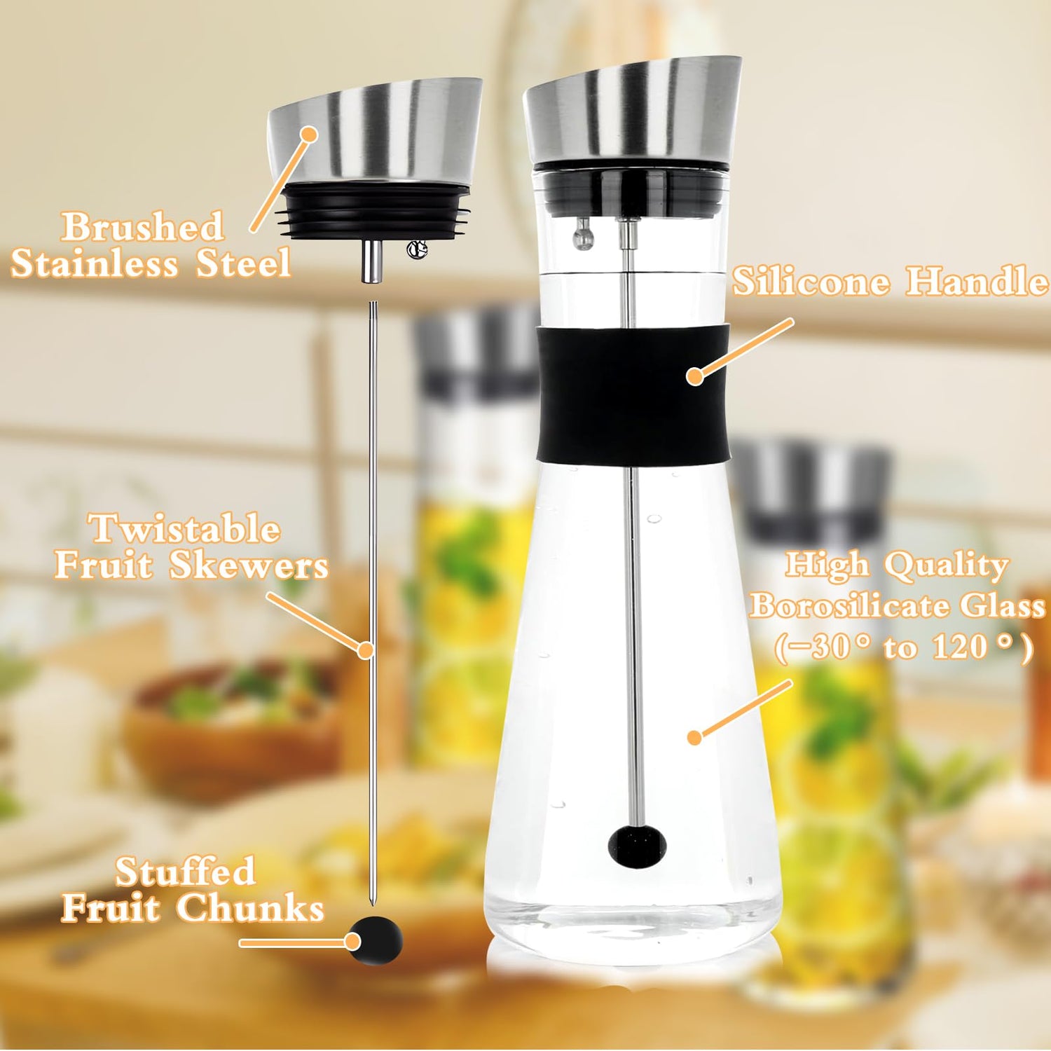 • 🍊🍊【Abnehmbare Fruchtspieße】Glas Karaffe mit Fruchtspieß Blockiert Fruchtfragmente,Sie können die Fruchtspieße verwenden verwenden können Sie Früchte wie Zitrone, Heidelbeere, Limette oder Vanille hinzufügen und so ein köstliches und gesundes Wasser herstellen.