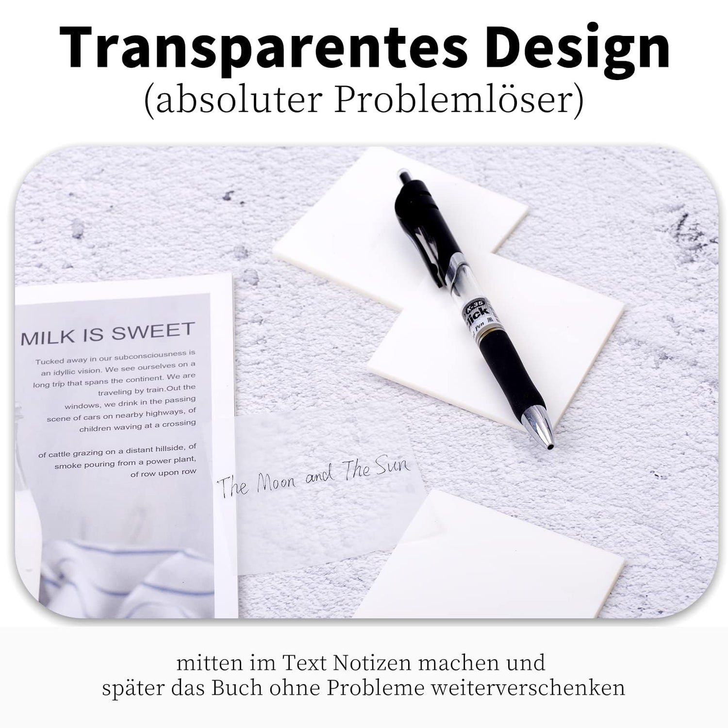 • 【Transparent】Der Haft-Notizzettel ist nicht absolut klar, sondern leicht milchig, aber durchaus durchsichtig. Die durchsichtige Haftnotizen können an Büchern, Lernbüchern, Magazinen oder Dokumenten angeklebt werden und ermöglichen es Ihnen, den Originaltext deutlich zu sehen und den Text zu markieren, Auf den Sie sich konzentrieren müssen.